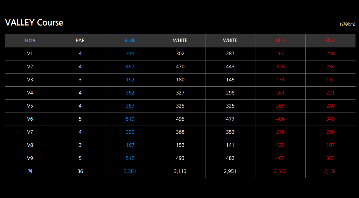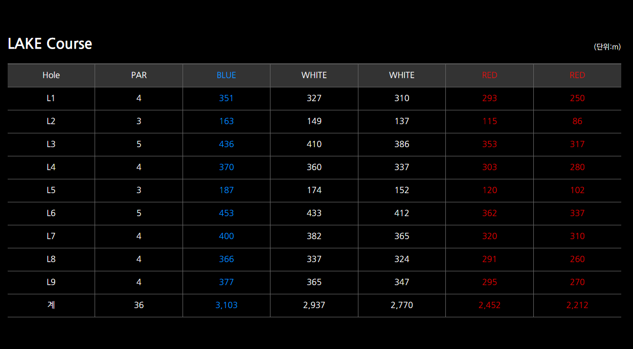 레이크 코스는 거위산 폭포를 본뜬 인공 폭포와 그린을 둘러싼 아름다운 호수를 갖춘 넓고 아름다운 코스입니다. 마운틴 코스는 아름다운 경치와 울창한 자연림으로 둘러싸인 섬형 홀을 갖추고 있어 골퍼들이 자연에 온전히 몰입할 수 있도록 합니다. 밸리 코스는 자연림 계곡과 아름다운 호수가 있는 전략적 위치에 자리 잡은 코스로, 골퍼들에게 자연의 경이로움에 경외감을 느끼게 하고 도전 정신을 고취시켜 줄 것입니다.
