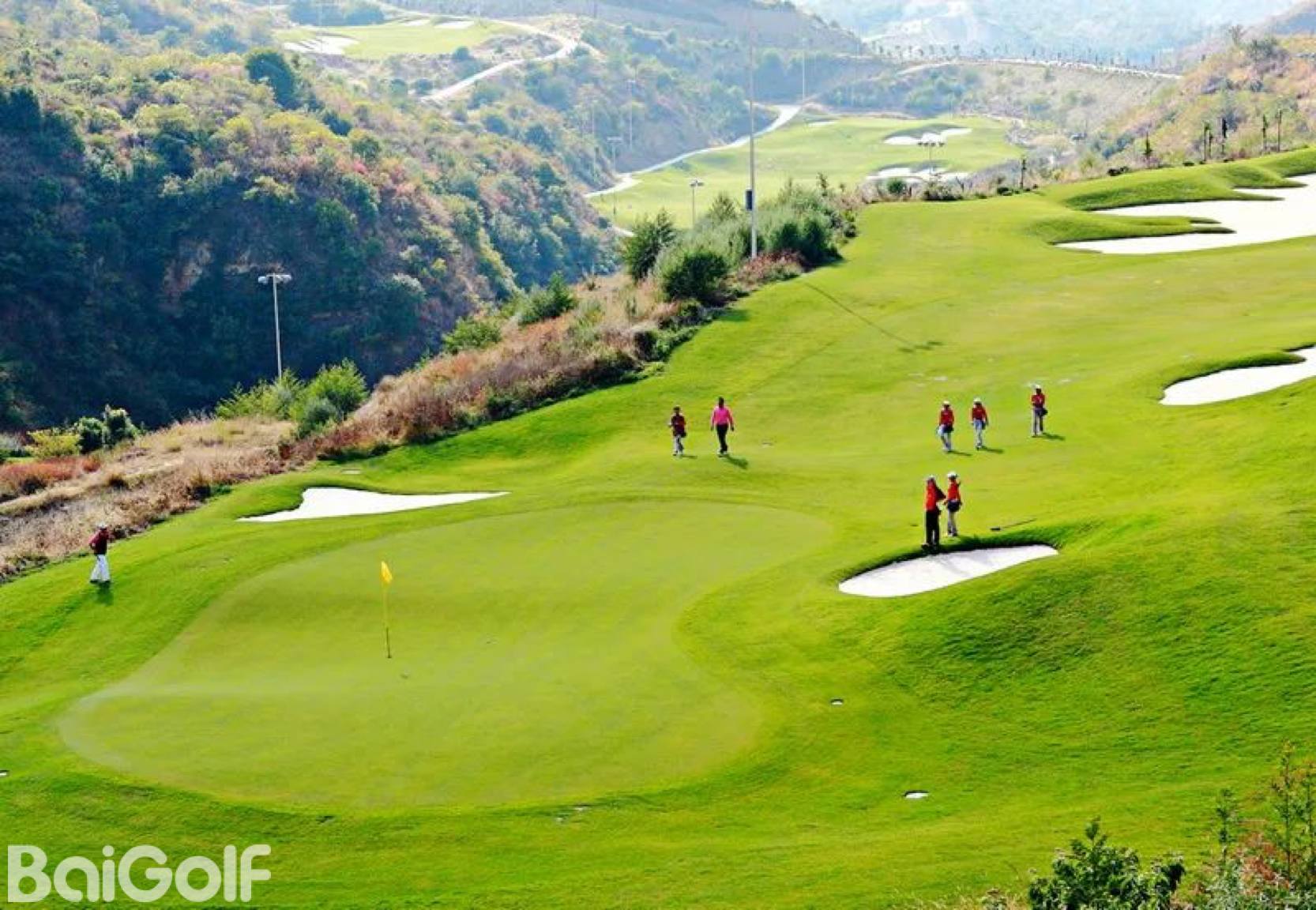 这类球场设计上通常将球道布置在山谷和半山腰的缓坡地带,各个球洞围绕着一个或几个山头往返布置,相互勾连,形成一体。