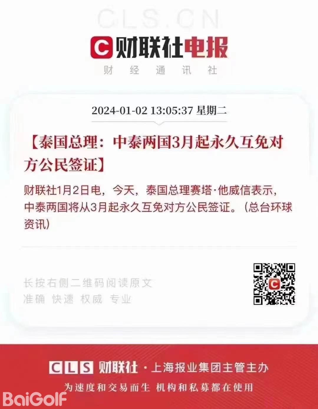 泰国总理赛塔1月2日在曼谷表示,泰国将自2024年3月1日起对中国公民实施永久免签政策。赛塔当天在总理府举行的发布会上说,此前已对中国公民实施了为期数月的入境临时免签政策。泰国政府一直与中国相关部门积极协商,最终决定自2024年3月1日起对中国公民实施永久免签政策。