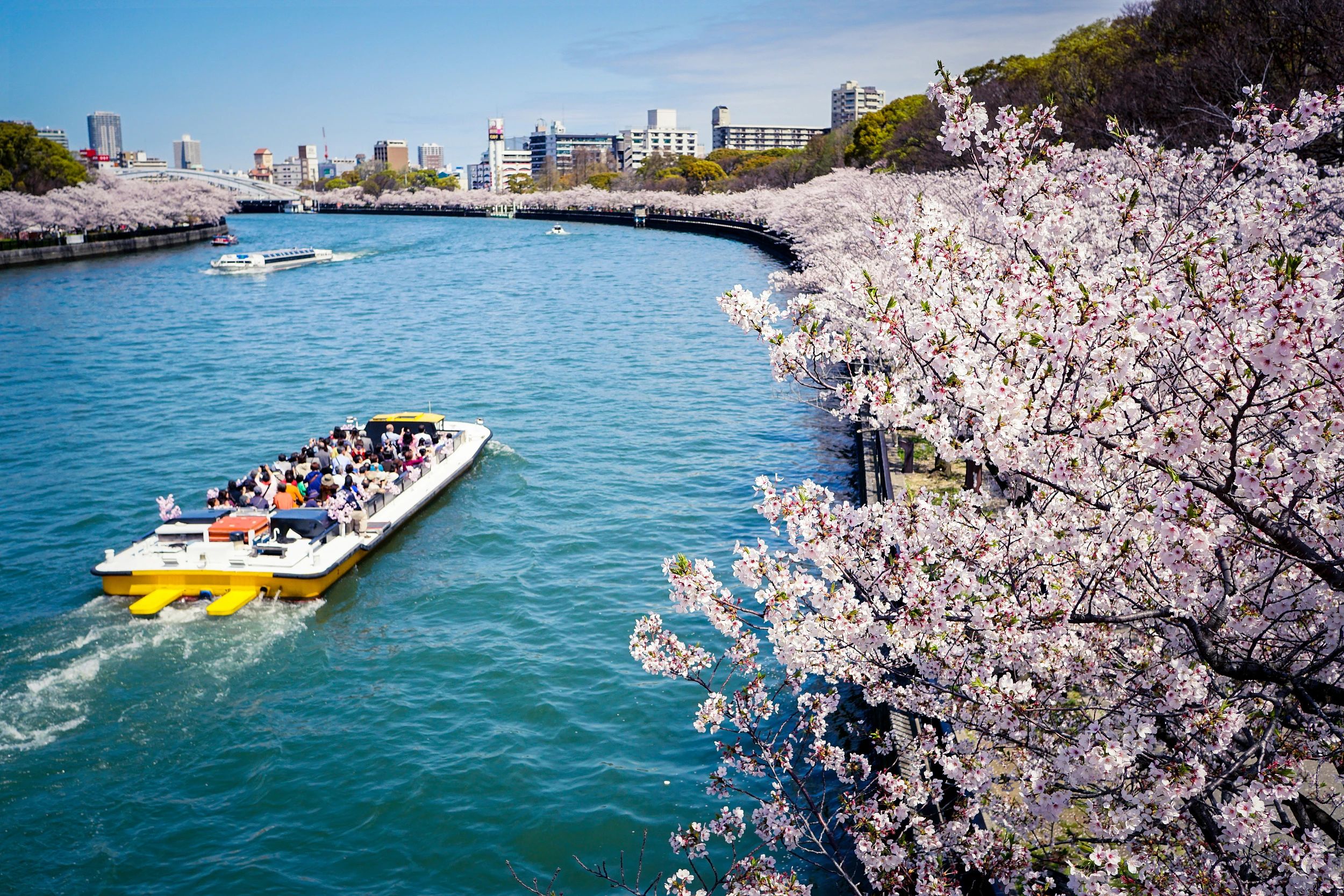 附近的造币局樱花大道则以樱花种类丰富而著称。这里,不同品种的樱花竞相开放,争奇斗艳,让人目不暇接。游客们可以在此欣赏到各种形态各异的樱花,感受大自然的神奇魅力。毛马樱之宫公园在代表水都大坂的大川沿岸,一到3月下旬坐船游行,河岸一片粉红。