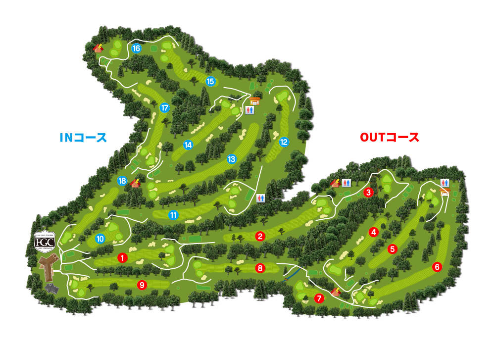 以赤松树区隔球洞,球道草坪辽阔,整体地形相当平整,球场间的间隔路程也很短,建议边走边打,让您一边悠哉地远眺富士山,一边打球(亦可搭乘高尔夫球车)。