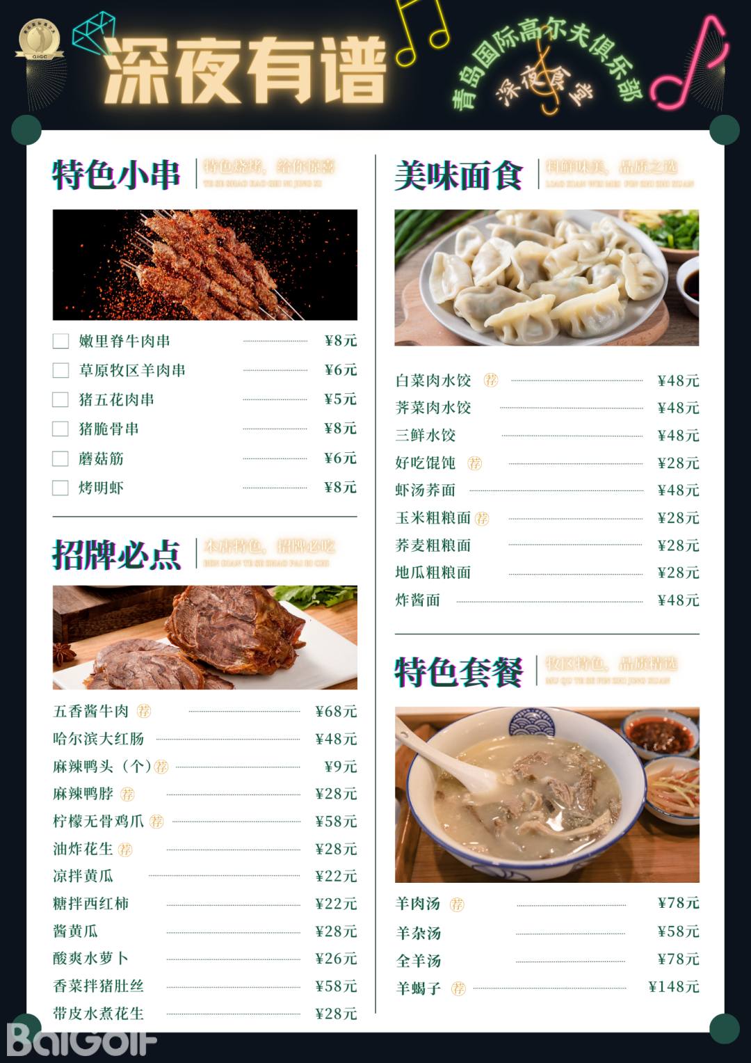 与美景相伴的,一定少不了美食。球场会所餐厅推出了“深夜食堂”,有丰富而美味的菜品供您选择,为您在下场之前补充能量,回场之后犒劳身心。