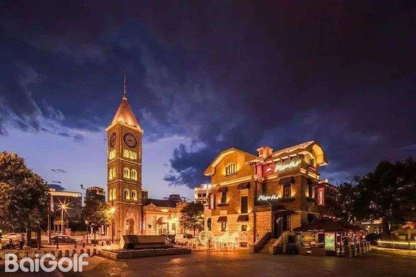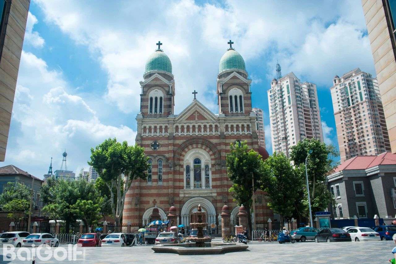 天主教堂,典型巴洛克式风格建筑。整体建筑呈“品”字形,楼座以黄、红花砖砌成,上砌翠绿色圆肚型尖顶,檐下为半圆形拱窗,值得一看。