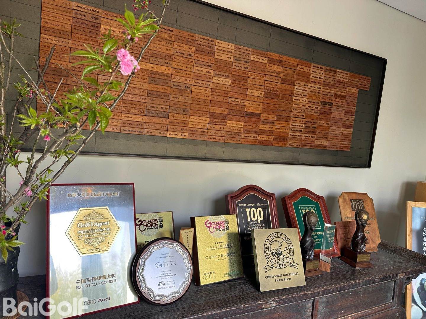 元朝の四大画家に数えられる「黄公望」は故郷のこの地に帰り、山水画の大作「富春山居図巻」を描いた。そのレプリカはホテル内に飾ってあるが、富春江の雄大な流れに沿って、丘が連なり、山々の間に家屋が見え隠れする情景は、まさにシャングリラ(桃源郷)。その「自然と人間の営みの調和」をコンセプトに台湾の製紙会社が建てたのが、このリゾート。ホテルのオープンは2004年だが、ゴルフ場のほうは既にオープンより数年を経ている。