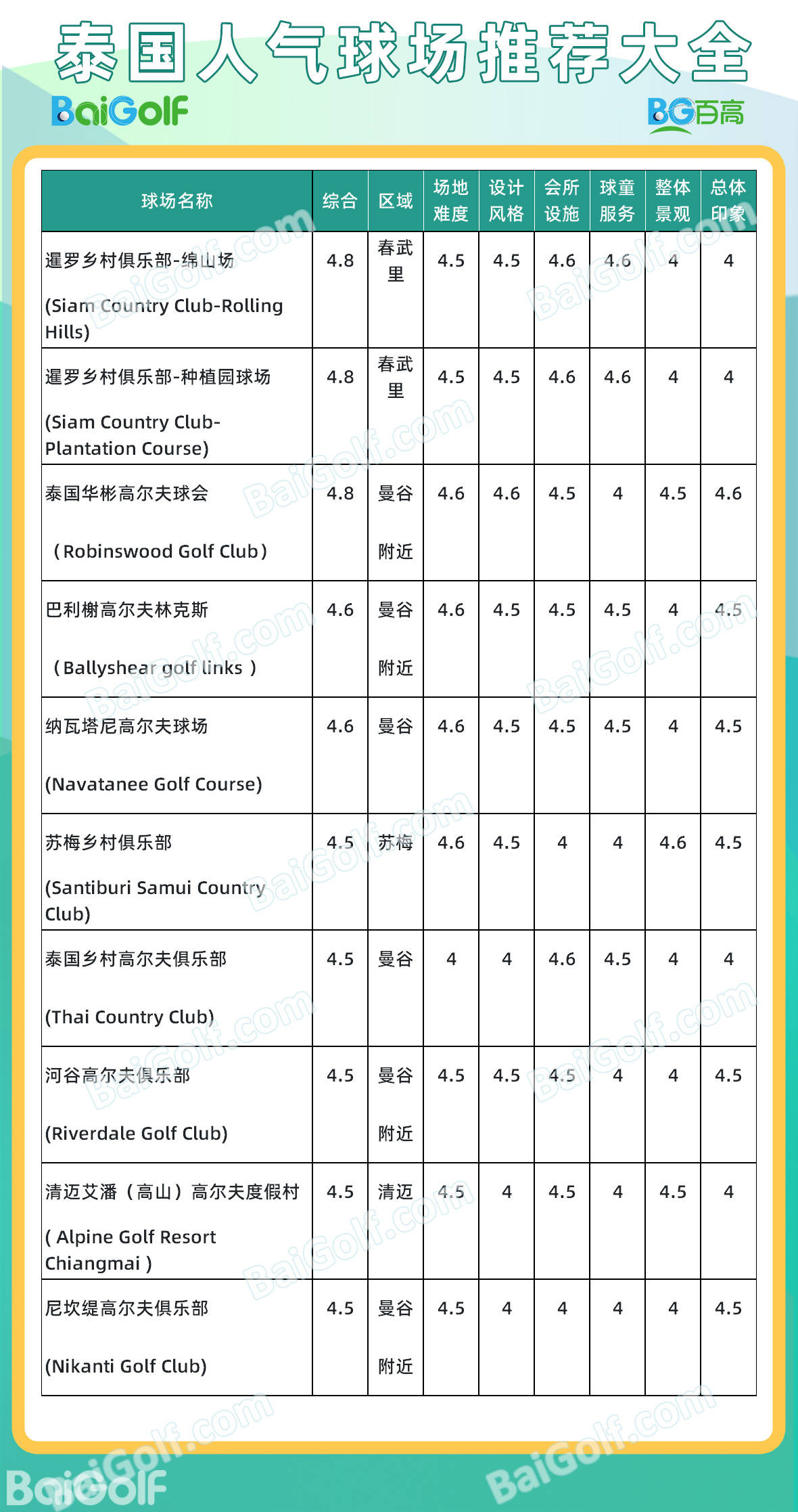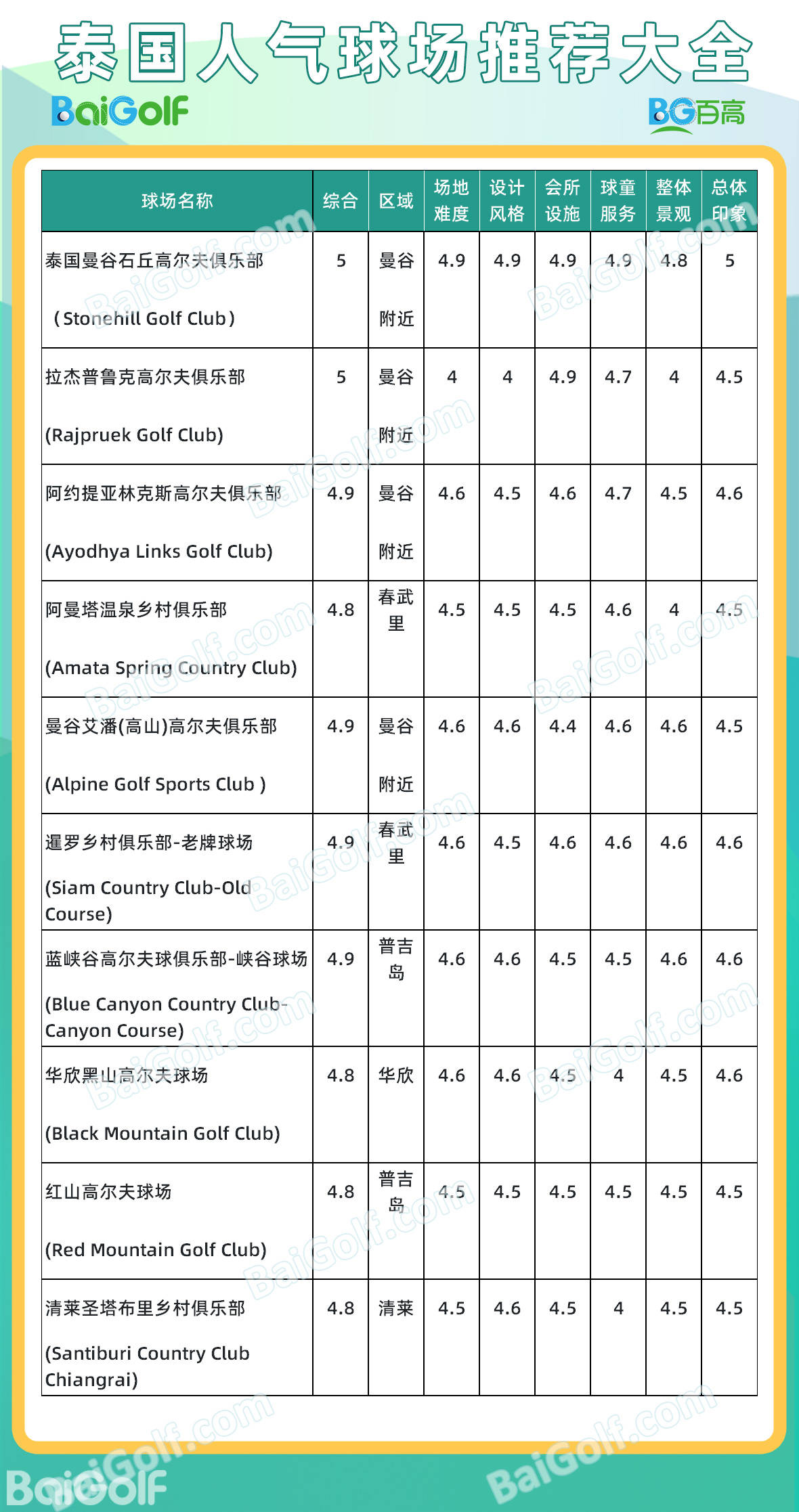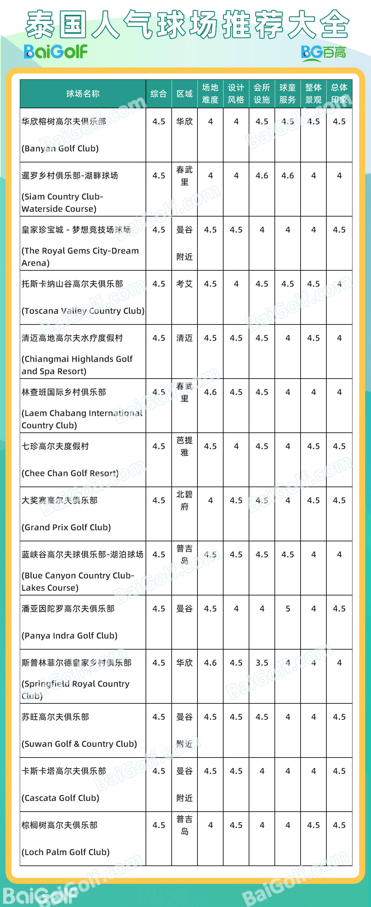 Baigolf基于10万+真实用户打分评论,以及长达一年的泰国高尔夫球场问卷调查跟踪,汇总出泰国高尔夫人气球场。