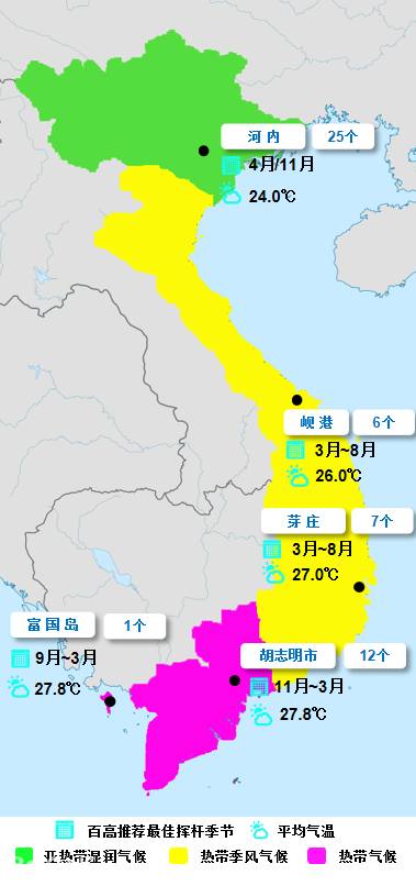 河内地处山区,四季分明,夏季(5 月至 10 月)降雨量最大,冬季(12 月至 3 月)气温最低,很多时候低于 10°C。百高推荐最佳挥杆季节是4月和11月。