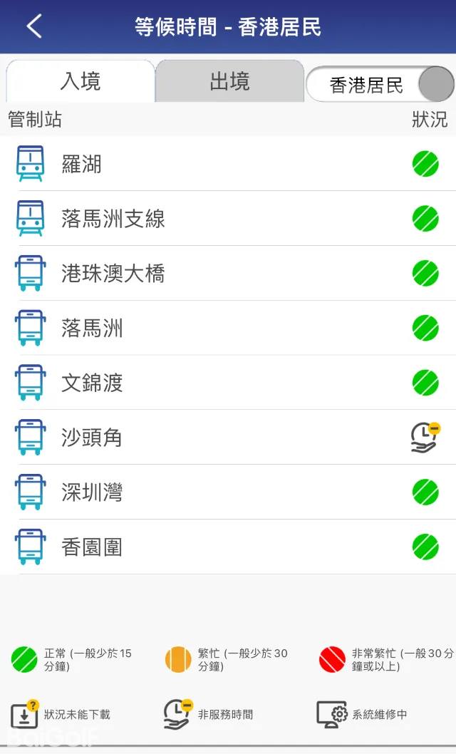 过关人流查询:出发前可以通过香港入境事务处APP里面的「陆路边境管制站等候时间」了解各个连接中港的出入境口岸之实时通关的人流资讯,资料会每15分钟更新一次。如过关口岸状况显示为绿色,则等候时间一般少于 15 分钟;橙色则代表等候时间一般少于 30 分钟;而红色则表示等候时间一般为 30 分钟或以上。