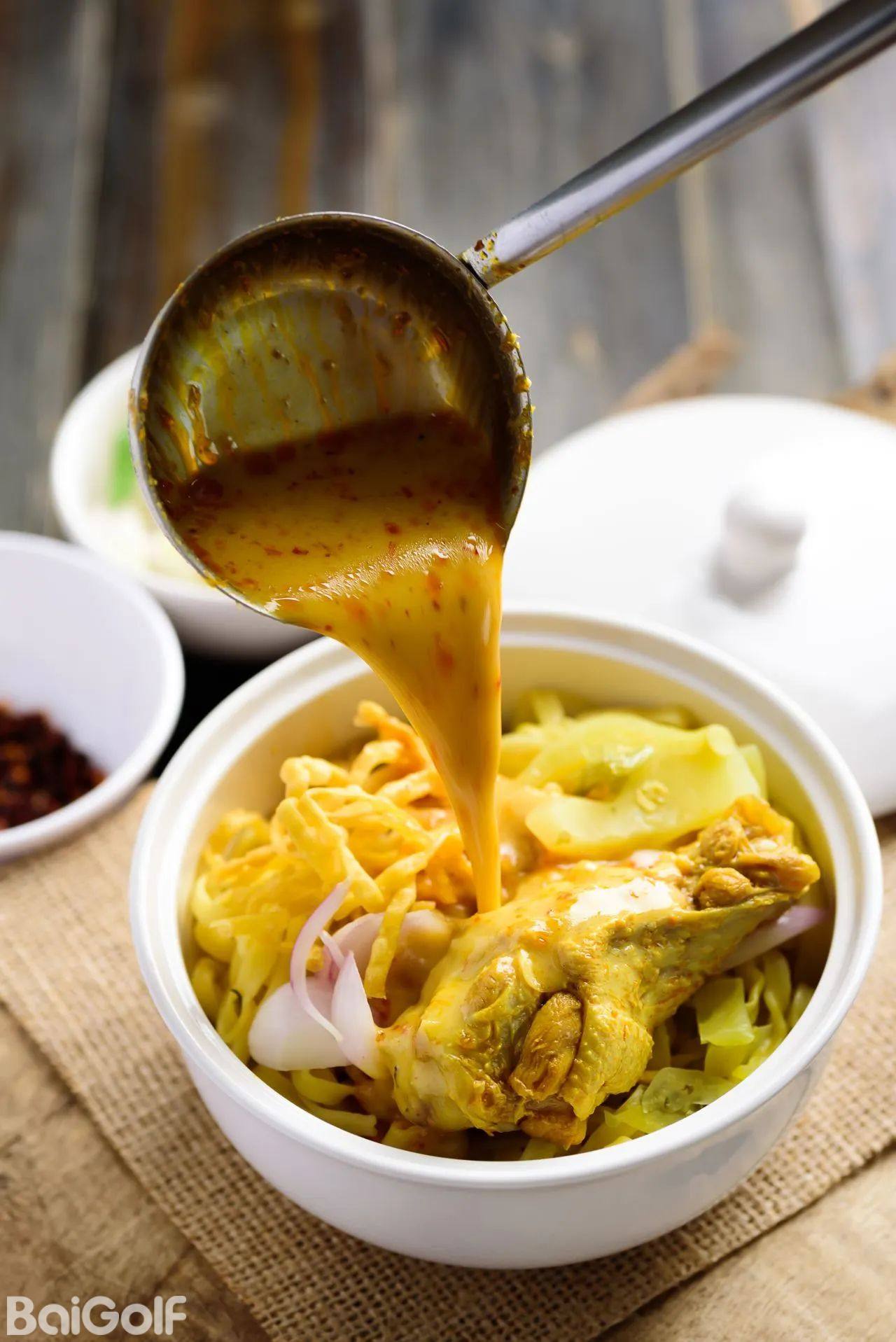 泰北咖喱面:泰北咖喱面是泰国北部的特色美食,曾在2022年被Tasteatlas评为“50最佳汤品”之首。这道面食以椰奶熬制的汤底和咖喱酱的辣味为特色,搭配面条、肉类(鸡肉、牛肉或猪肉)、脆皮炒面及多种配菜,如腌芥菜、葱段、油炒辣椒和酸橙。