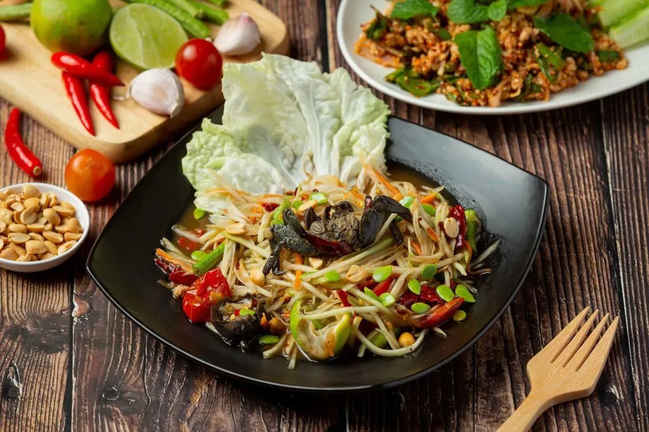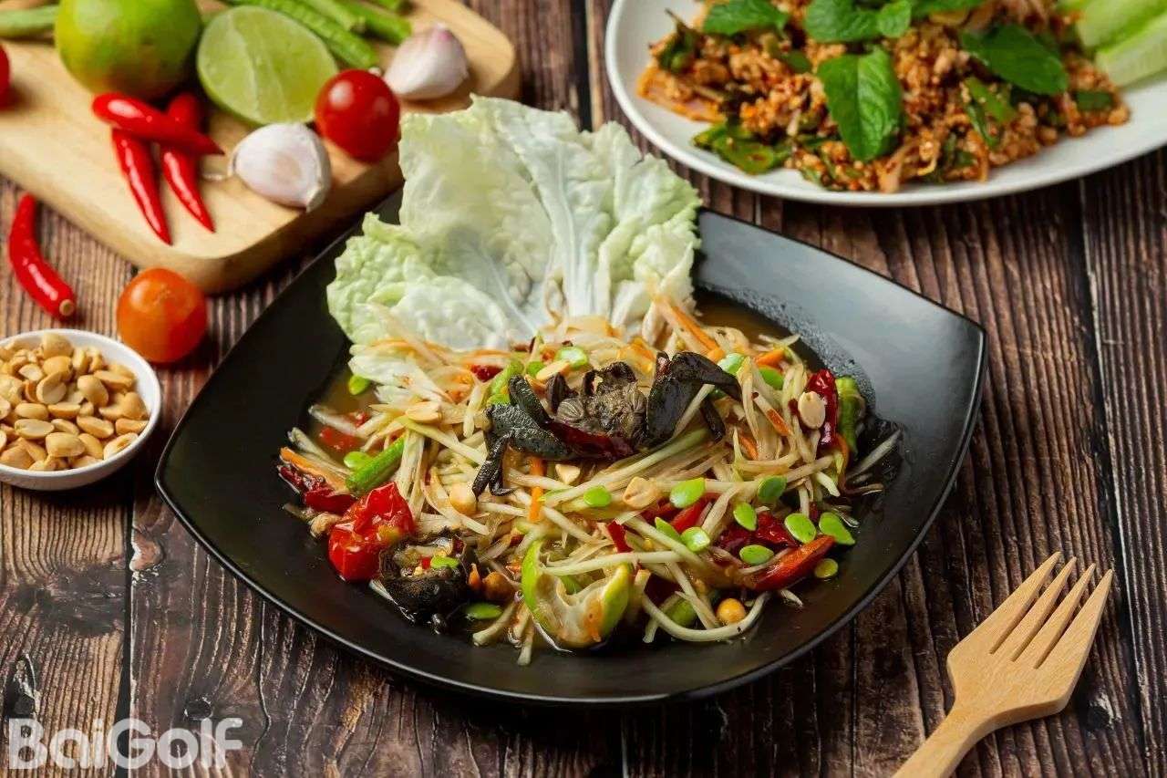 青木瓜沙拉:青木瓜沙拉,这道泰国东北部小吃在全球广受欢迎,以其独特的五味——酸、甜、咸、辣和醇厚而闻名,2023年荣登世界最佳沙拉榜单第六位。主要食材包括青木瓜、小番茄、苦茄子、辣椒、豇豆和大蒜,调味则依赖棕榈糖、鱼露和青柠檬汁。