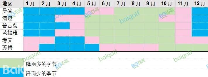 最佳挥杆季节是旱季,此时降雨较少,气温较低,但由于季风对泰国海滩度假胜地的影响,安达曼海和东部海滩度假胜地与泰国湾海滩度假胜地的最佳旅游时间有所不同。