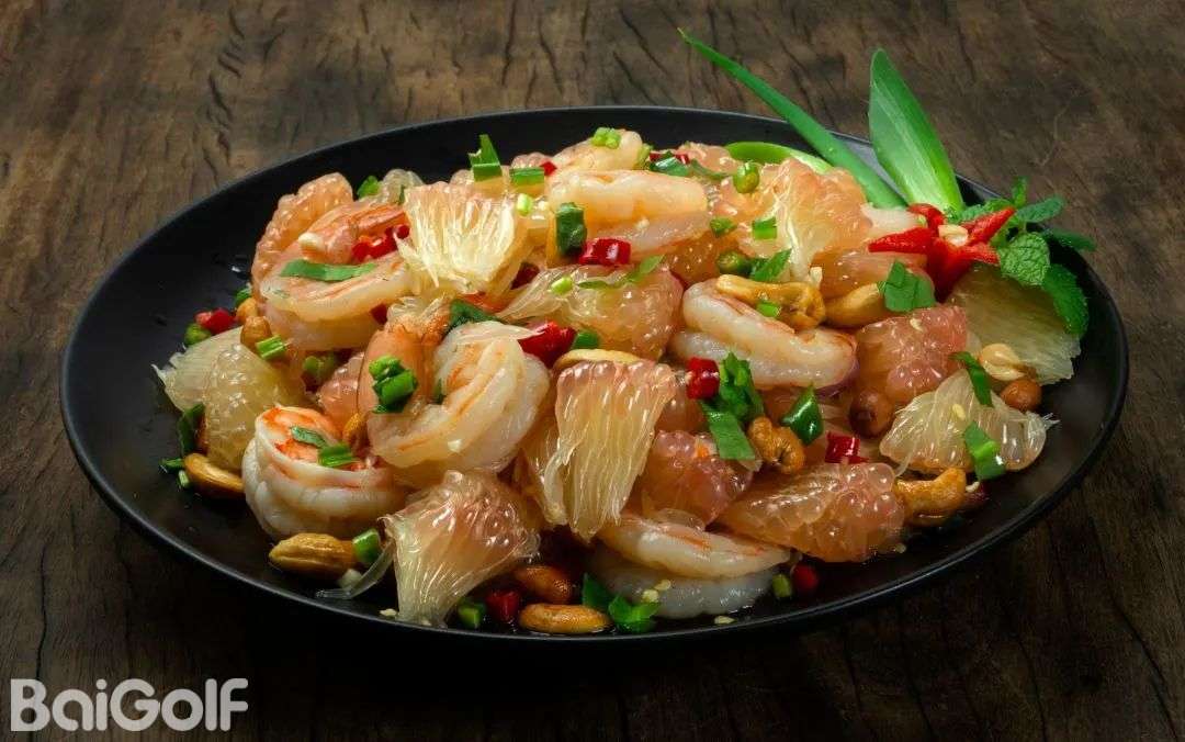 柚子沙拉:泰国传统的一种风味沙拉,以其甜、酸、咸、辣的复合口感而闻名,常作为开胃菜享用,口感鲜美多汁。这道沙拉的调味基础包括鱼露、棕榈糖、青柠檬、青葱和辣椒,而虾米、烤花生、烤椰子片、炸洋葱则作为增加风味的配料。柚子沙拉的酸味主要来自柚子本身,如果不喜欢过于酸的口感,可以选择不加柠檬汁。