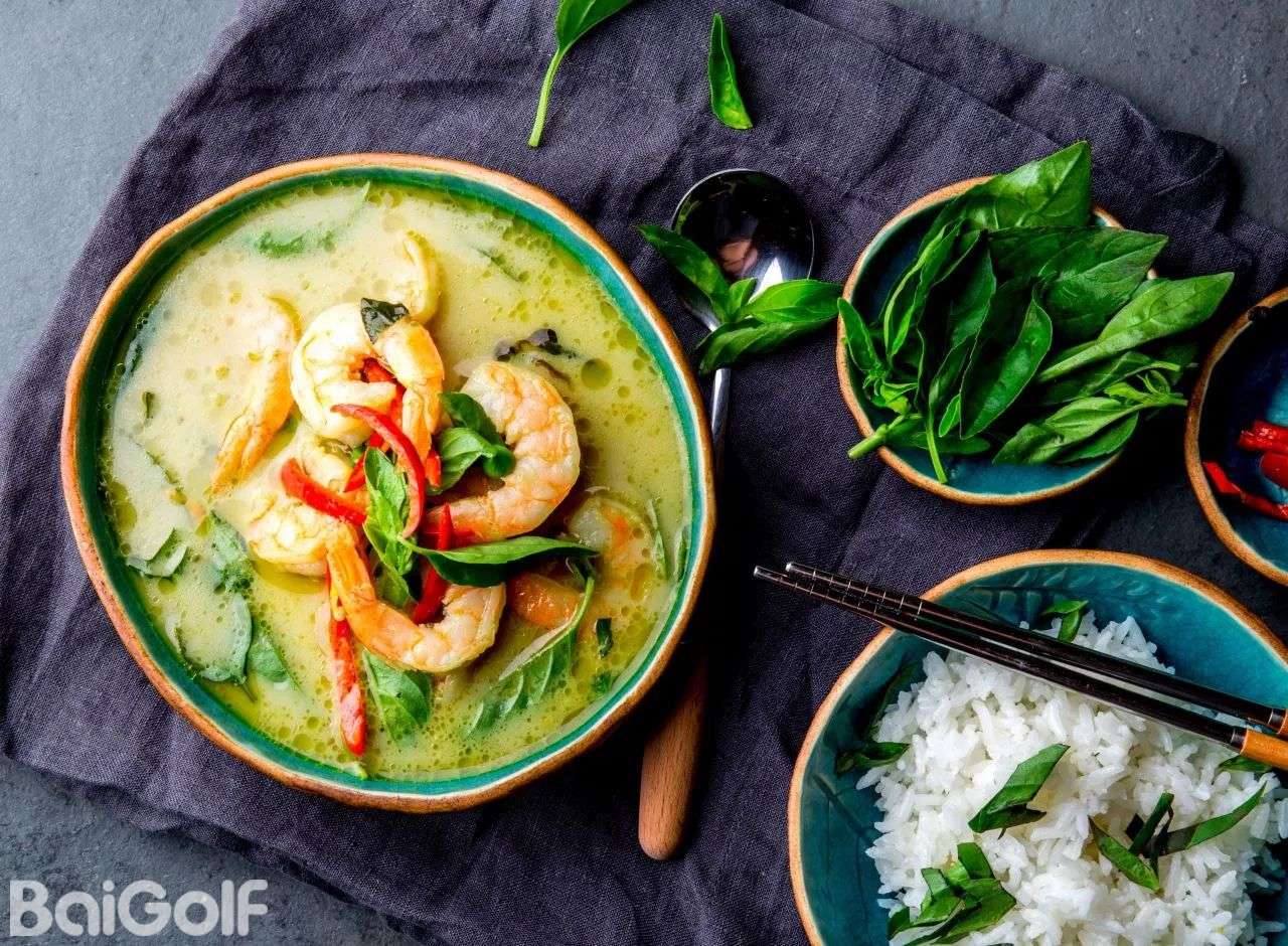 绿咖喱:绿咖喱是一种辣味咖喱,主要成分包括绿咖喱酱、罗勒和椰奶,味道先咸后甜。绿咖喱酱由青辣椒和青鸟眼辣椒制成,加入椰奶炒至浅绿,再混合多种香料捣碎,增加香气。通常与肉、蔬菜和米饭或米线搭配食用。
