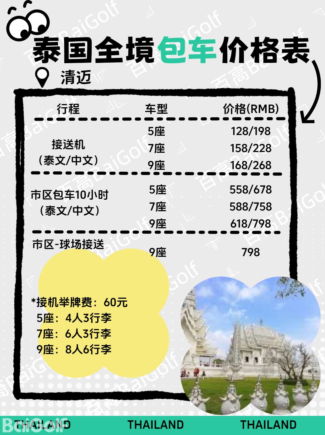 清迈:清迈古城、塔佩门、双龙寺、清曼寺、夜间动物园、黑庙白庙、辛哈公园、因他农山国家公园、素贴山、双龙寺、嘟嘟车泰国服装体验、清迈大象活动、人妖秀