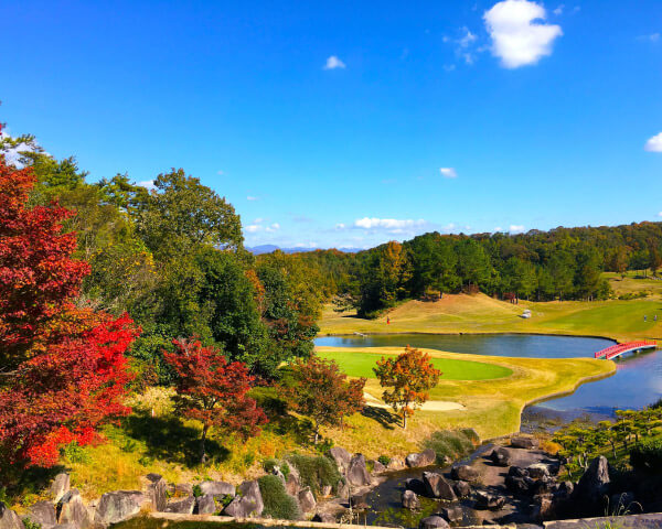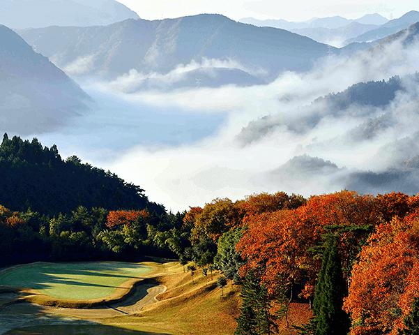 前9洞借用了以本州最晚紅葉而聞名的龜島湖的絢麗秋色,而 後9洞則以紅葉相隔,讓您盡享秋天的高爾夫風情。