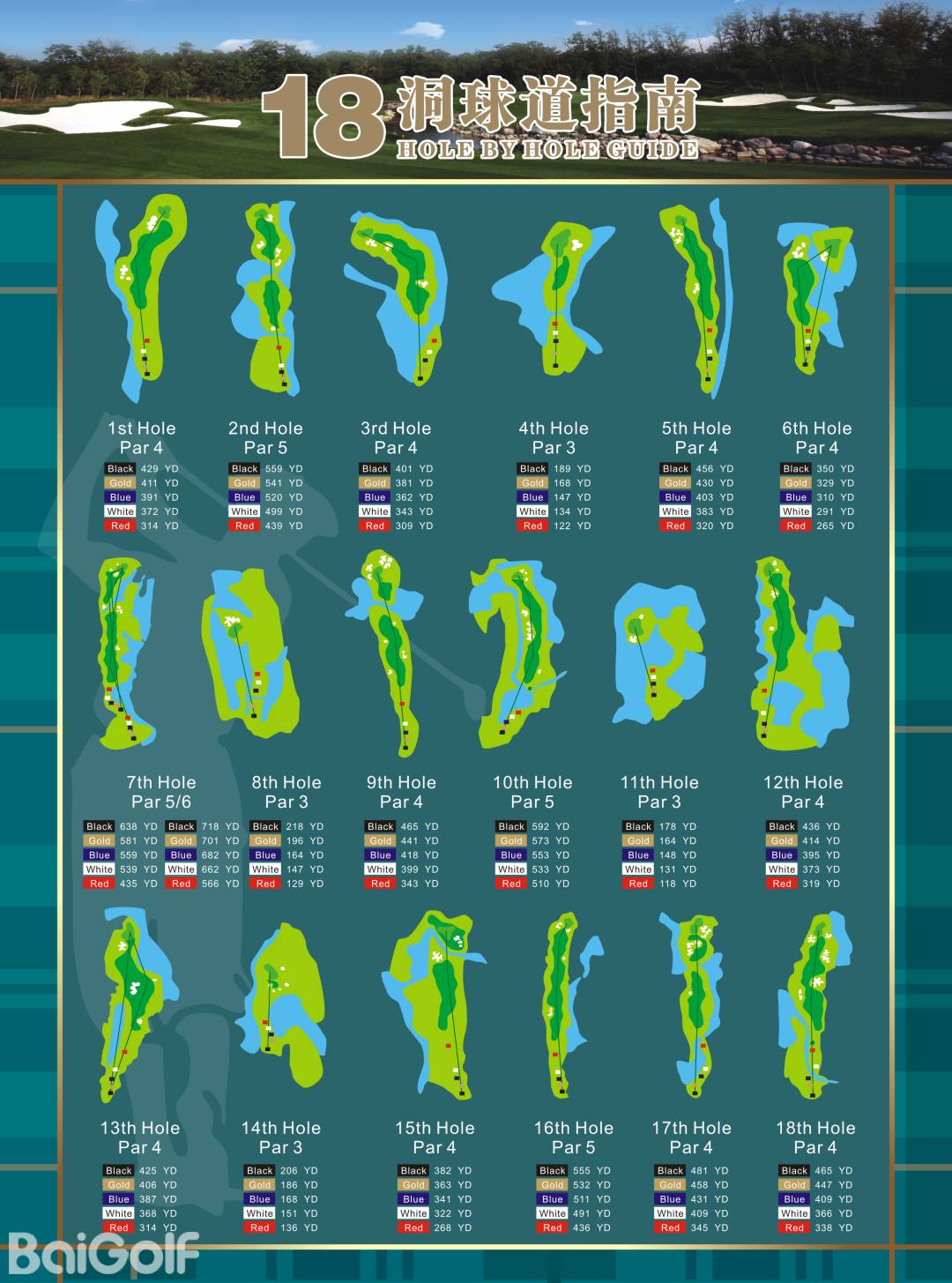 球場由國際知名設計師陳川源先生設計占地1000余畝,整體設計充分利用周圍的起伏地形和自然美景,與大自然配合得天衣無縫,球手在整個打球過程中漫步林間、溯溪而上,整個18洞包含了丘陵、林地、湖泊等多種風格的球道,充分發揮高爾夫球的挑戰精神,對高球人士充滿巨大誘惑。7532碼的球場總長度,更增加了球場的整體難度,不斷激發球手的征服欲望。