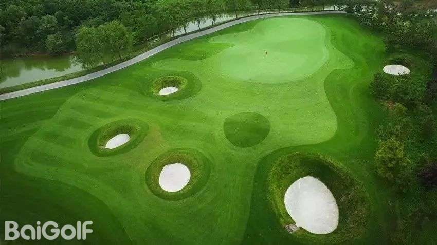 全島型果嶺,四面環水,開球時須注意攻果嶺左邊及右後方的沙坑。