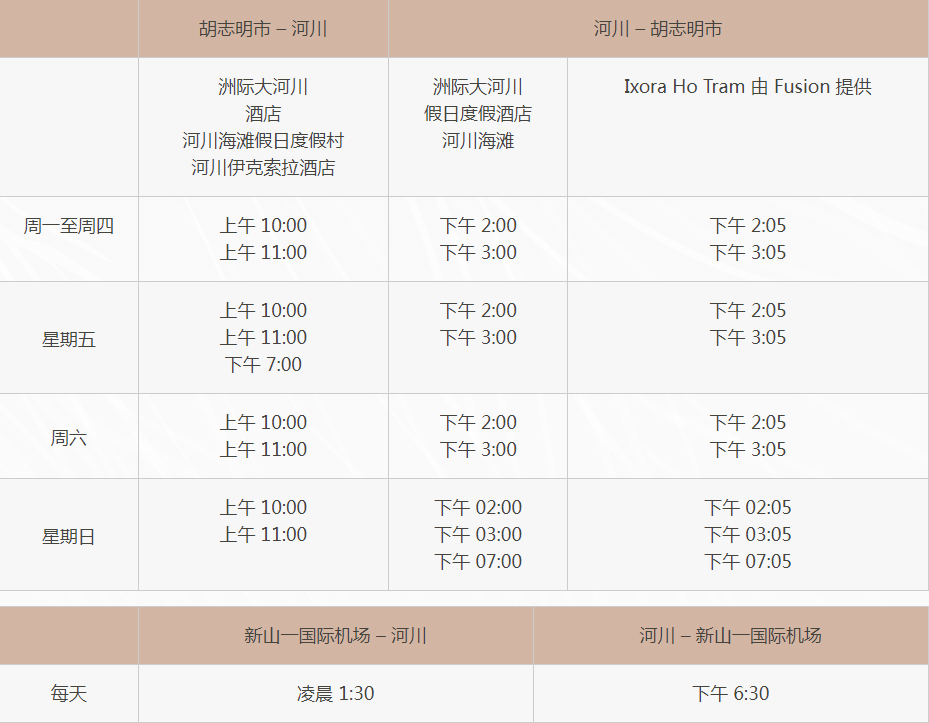 从胡志明市出发,乘车约 2 小时 30 分钟即可抵达度假村,具体时间取决于交通状况。这里有免费每日班车,位于第 1 区阮文树街 217 号海哈大厦,参考时间表如下: