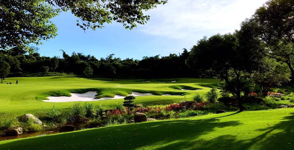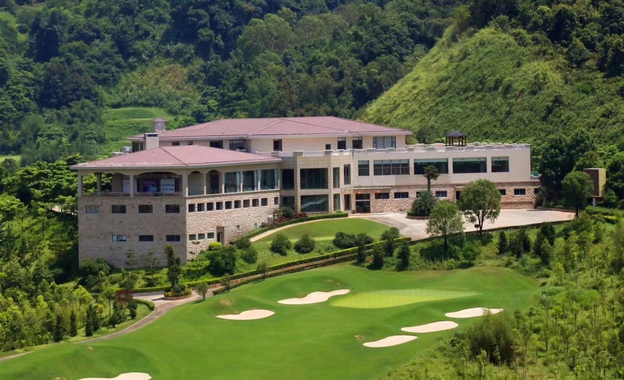 球场三面环山,一眼望去,峰峦叠嶂,郁郁葱葱,名贵的沉香木、樟树、美竹与原生态森林构成天然氧吧,精心布置的白色沙坑和湖水相互映衬,无论您在球场哪一个角落都能感受到这片高尔夫乐土的宁静与美丽。球场美丽但不奢华,温婉却暗藏杀机。果岭依山而建,在山丘、陡坡间起伏不定,坡度刁钻,易守难攻,极富挑战性。整个球场的设计充满梦幻和错觉,置身于世外桃源球场,体验“一洞一世界”的美妙。