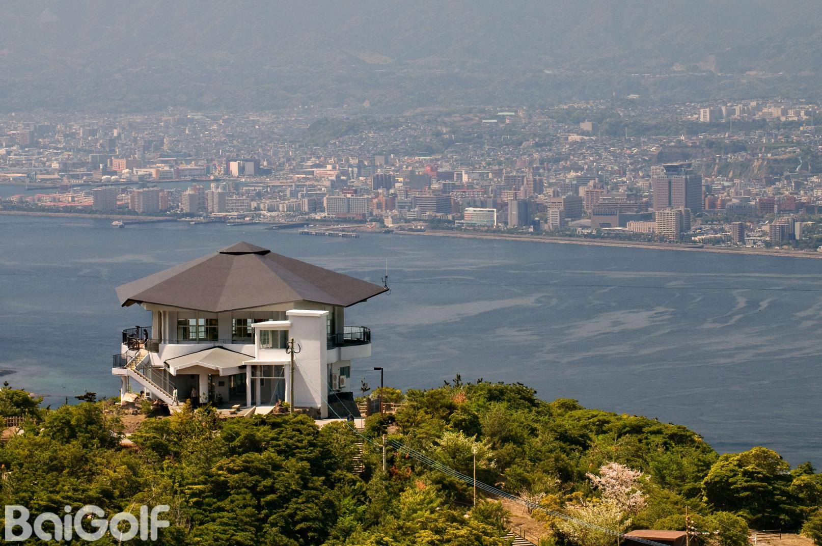 俯瞰鹿儿岛这座依海湾而建的城市。随着深秋的到来,城中的树木披上了五彩缤纷的秋装。