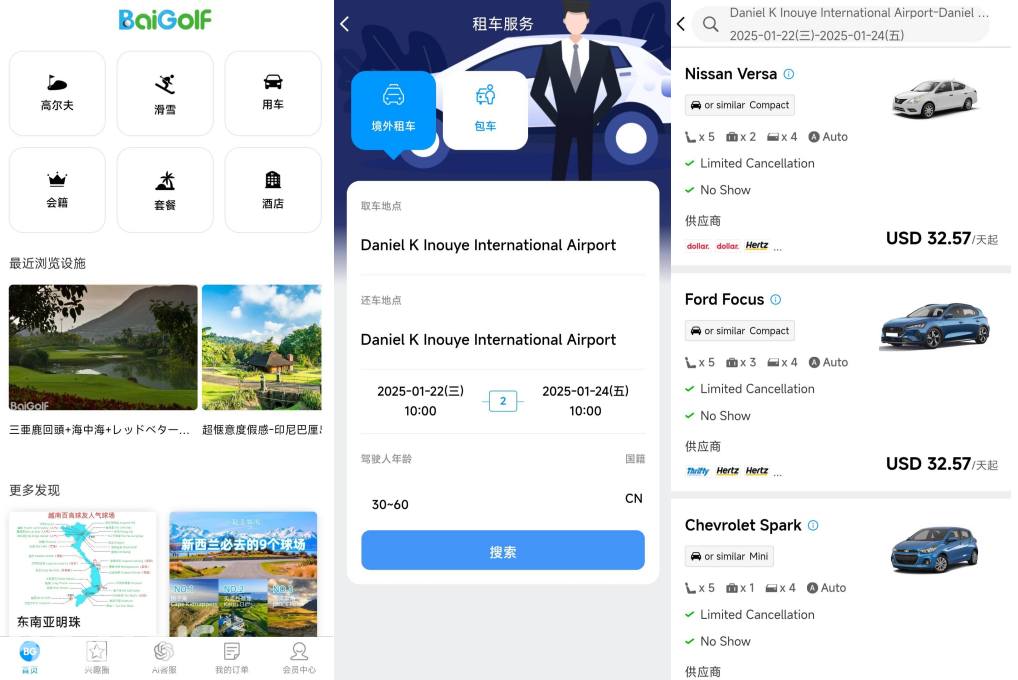 點擊用車→境外租車→輸入取車城市的英文地名,選擇取車點(若異地還車,請修改還車地點)→修改取車時間和還車時間→搜索→在列表裏選擇妳想要的車型下單