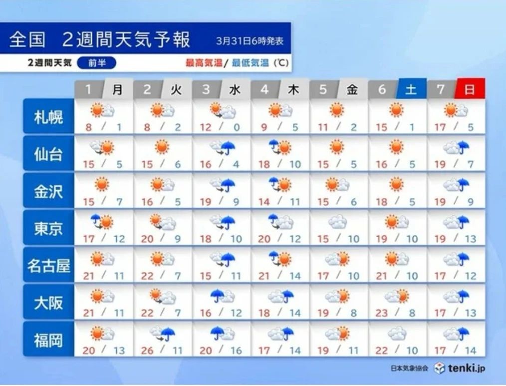 因爲冷空氣影響,上周不少球友到了東京反饋,還沒我家門口小區櫻花開的多!這周東京櫻花終于陸陸續續開放了,接下來壹周,會達到滿開和櫻吹雪!以下是未來壹周全日本主要城市的天氣預報,東京今年賞櫻的最佳日期應該是在周六(6號),加上清明假期,有興趣的朋友可以安排起來了!