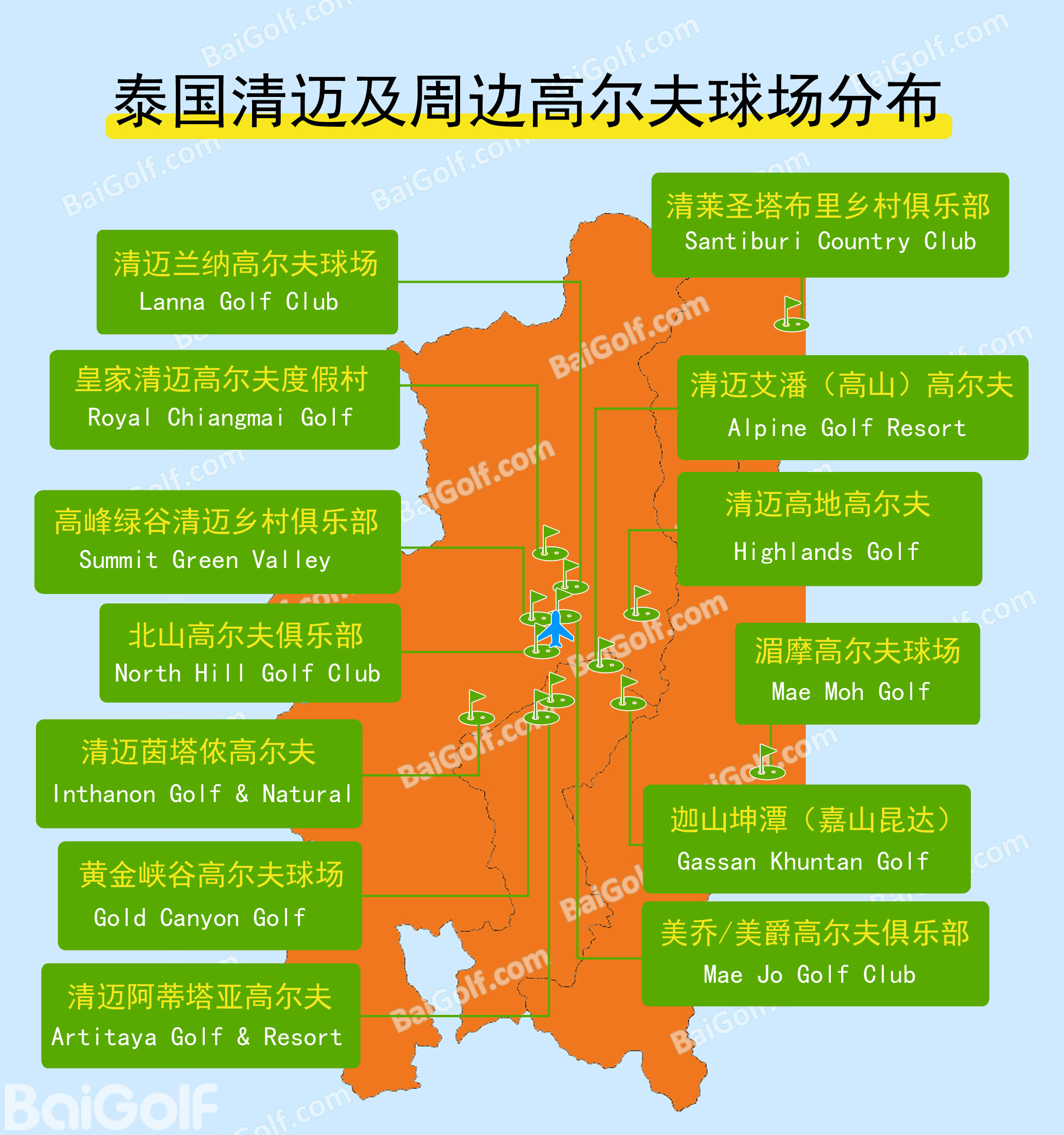 在清邁,距離市中心壹小時車程範圍內分布著 10 多個球場,最近的球場僅需 20 分鍾車程。