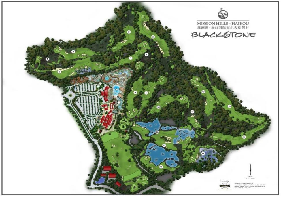 中长三杆洞。果岭周围被沙坑围住,但是果岭相对较平,果岭旁边有一自然的岩石平台和成熟 的荔枝树。发球台以及半个球道区域都被岩石包围,看起来确实令人生畏。但沉着冷静些,将 会有惊无险。