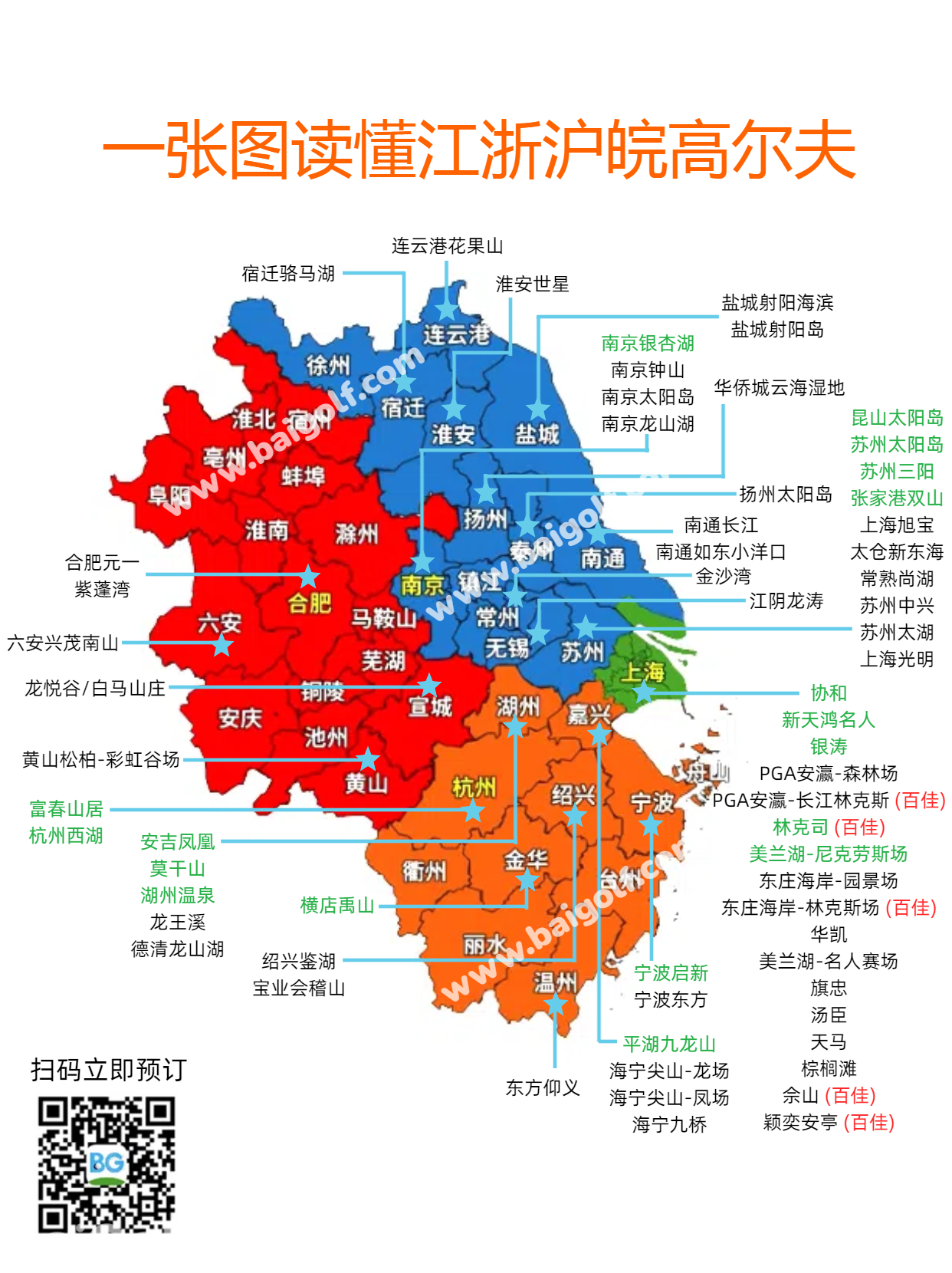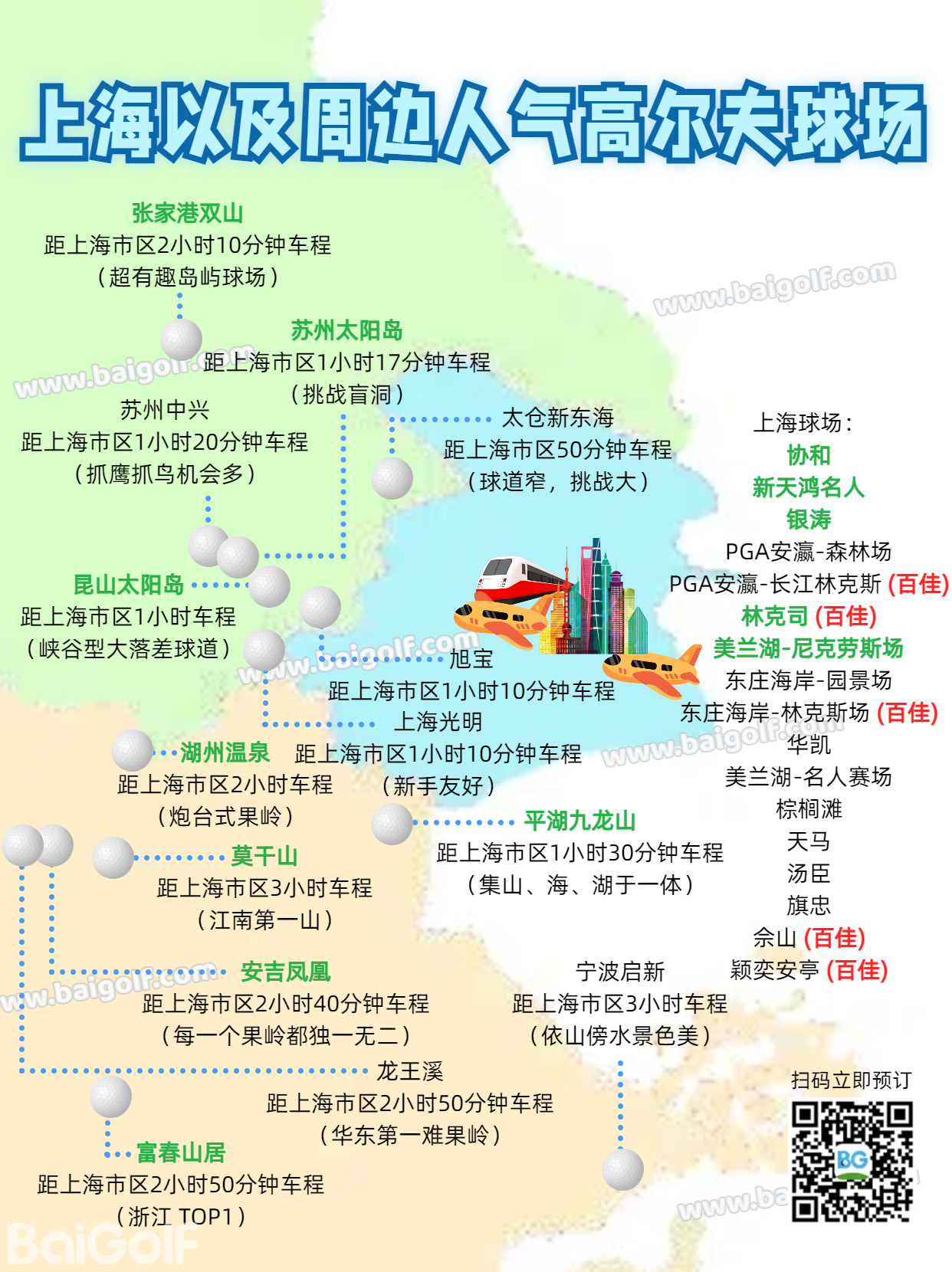 上海以及周边超热门球场:银涛(澳洲风情/高端体验)、协和(老字号/景观好)、林克司(美式风格/海上林克斯)、新天鸿名人(疗伤胜地)、平湖九龙山(有山有海/独此一家)、昆山太阳岛(峡谷型大落差)、PGA安瀛(城堡球场/亚洲百佳)、美兰湖(人气超高)、苏州太阳岛(性价比)、苏州三阳(水之三阳/性价比高)