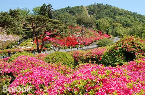 4月,山脚下的杜鹃园里,40个品种、10万株杜鹃花盛开,犹如一片鲜红的地毯。杜鹃隧道是一条小径,两旁种满了高过头顶的杜鹃花,是极受欢迎的拍照景点。