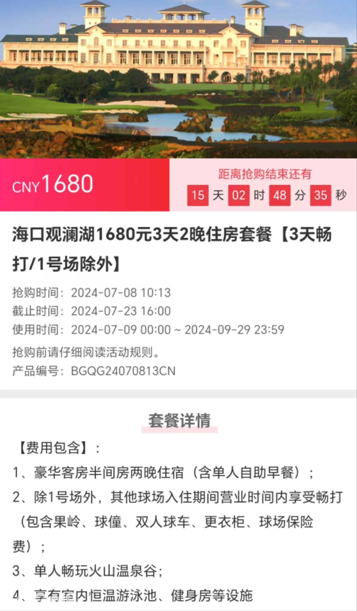 包含套餐雅致客房三晚连住,早餐三次,三轮18洞高尔夫(周末节假日通用);