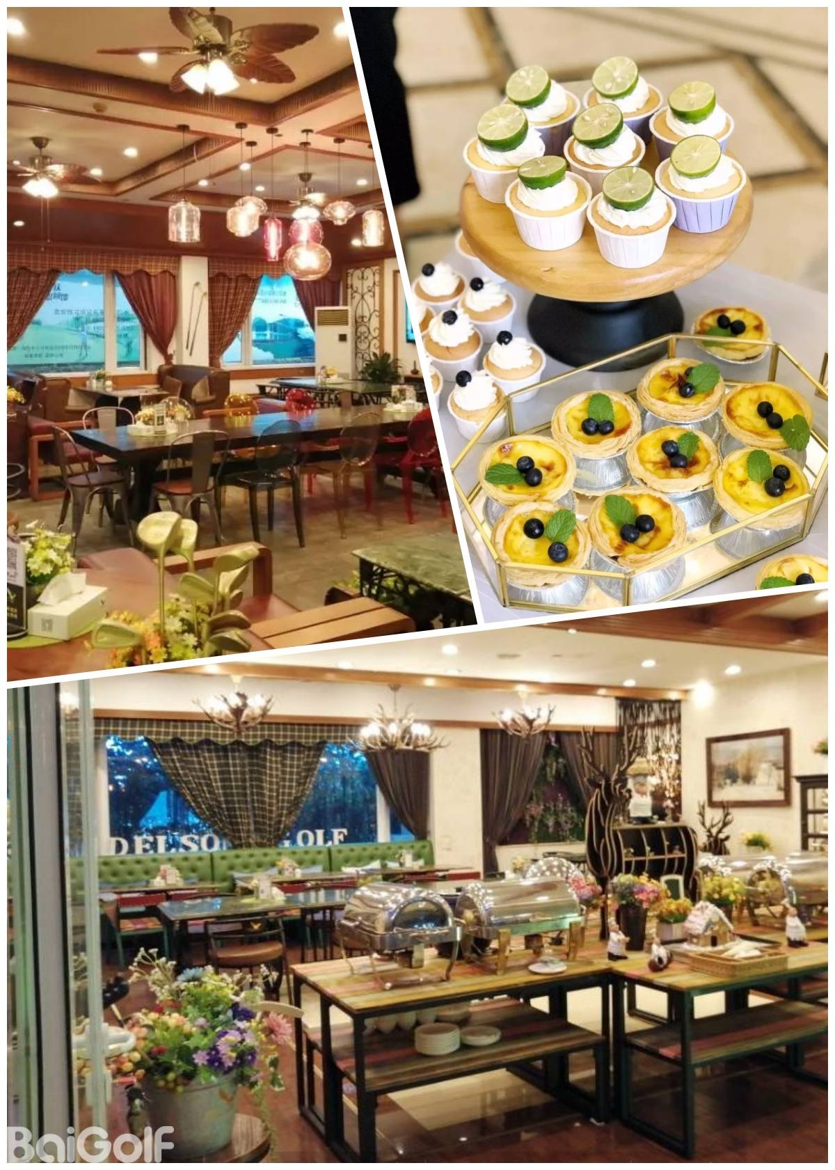 根据打球时间营业,提供度假村客人早餐,可以使用咖啡、奶茶、各给小吃和简餐。更提供产品展示区域,吃完饭顺便看看很方便。后现代美式设计,中间有一个5米长的桌子,可以举行儿童生日派对。