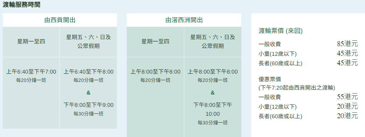 行走西貢與滘西洲之渡輪服務班次每隔20分鍾壹班,每段航程約需時15分鍾。每日晚上8時後,渡輪班次維持每30分鍾壹班。抵達滘西洲後,請乘坐穿梭巴士前往行政大樓。