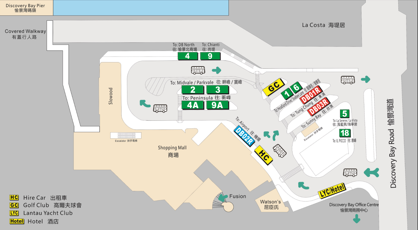 愉景灣碼頭出來走到公交車站(2分鍾),找到愉景灣專屬車道(上面寫了DB,golf),有愉景灣接駁車(免費),大約5分鍾到球場門口。