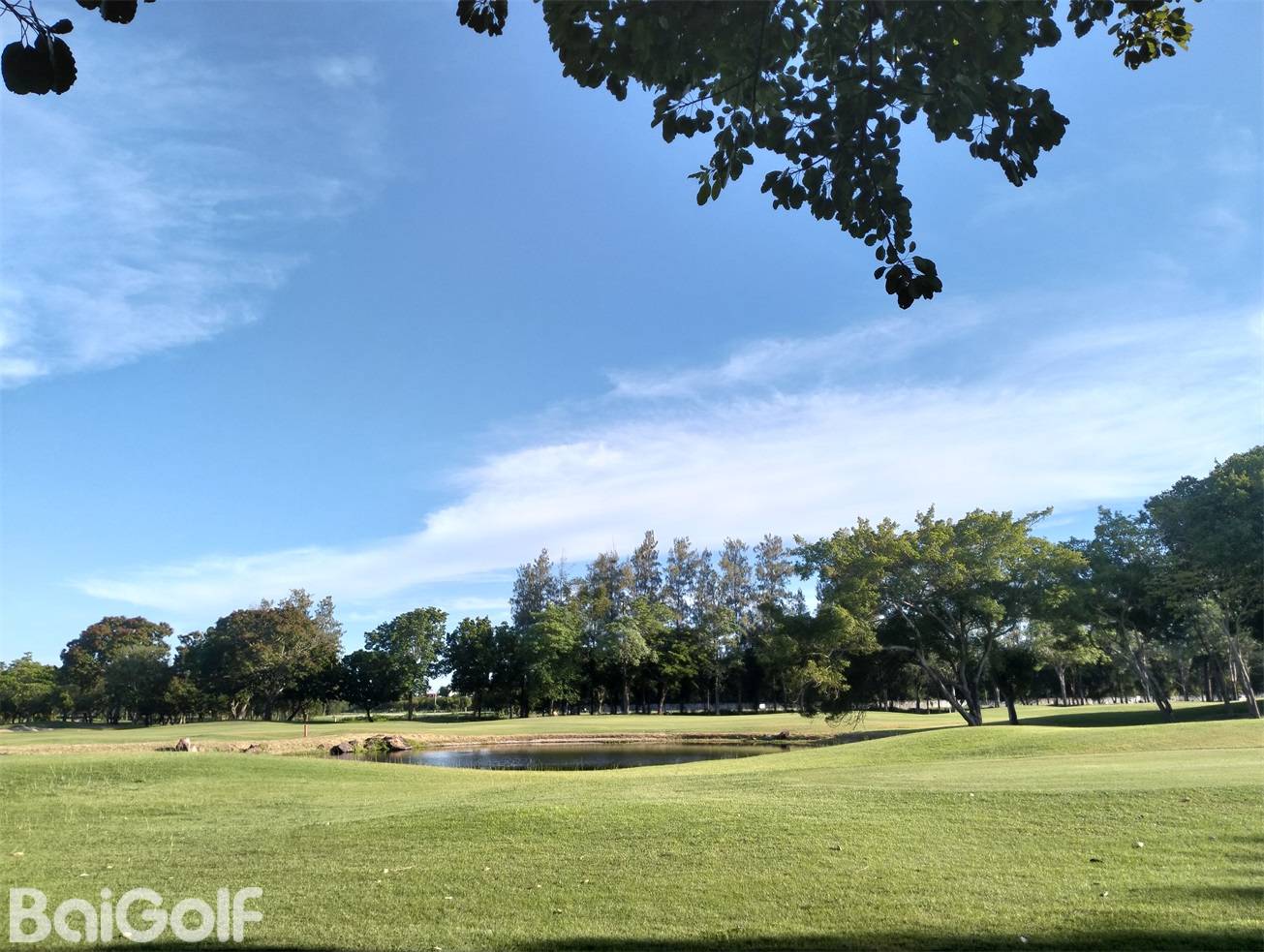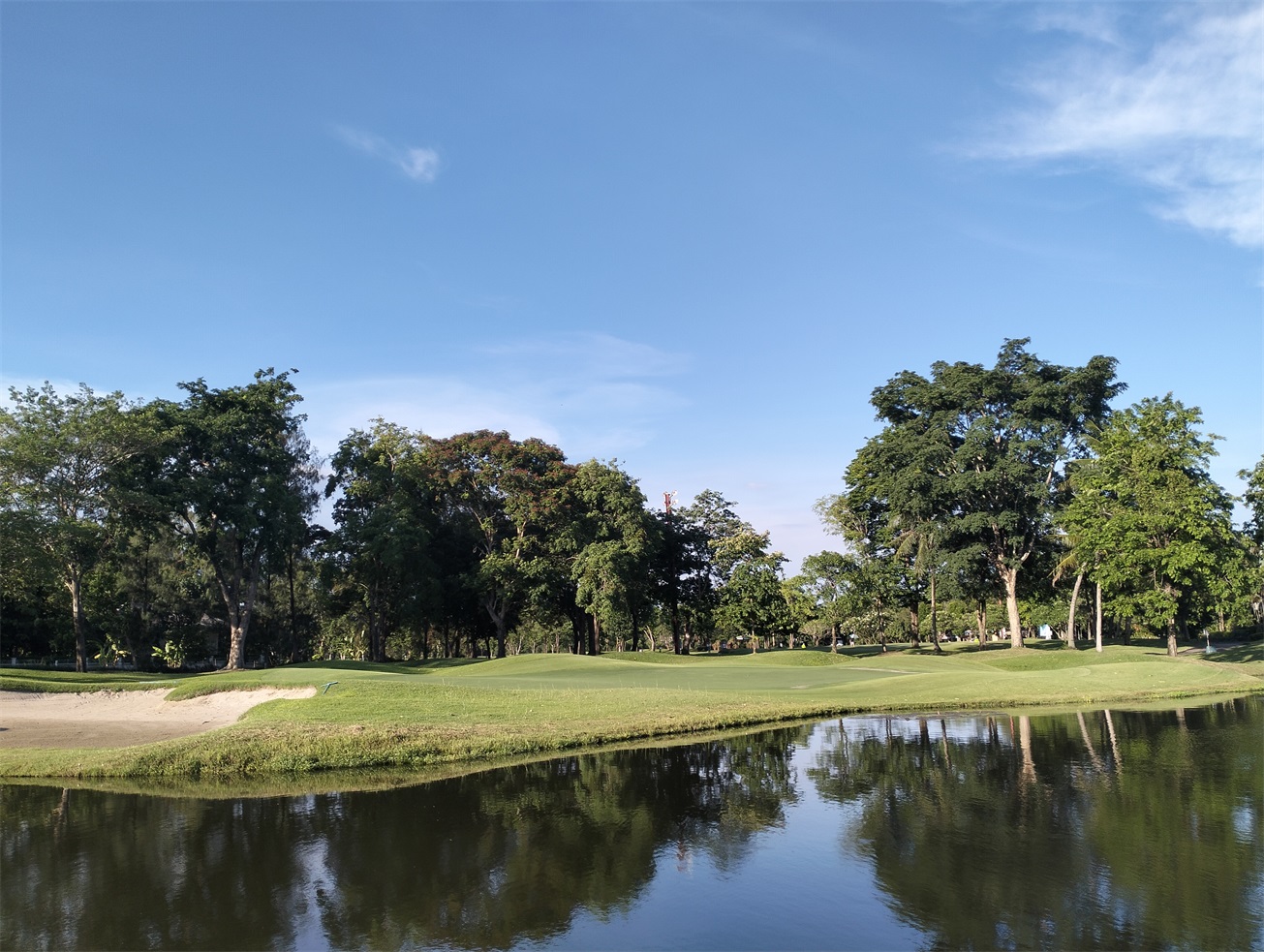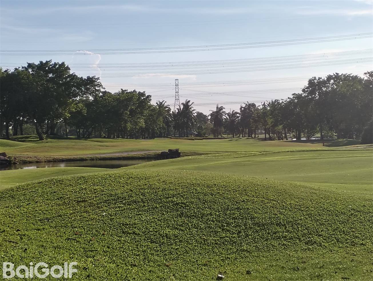 整个球场被热带树木环绕,虽然乍一看很平坦,但球道有的地方起伏很平缓,而且有很多大胆的球洞都有水障碍。还是有一定的挑战性的。