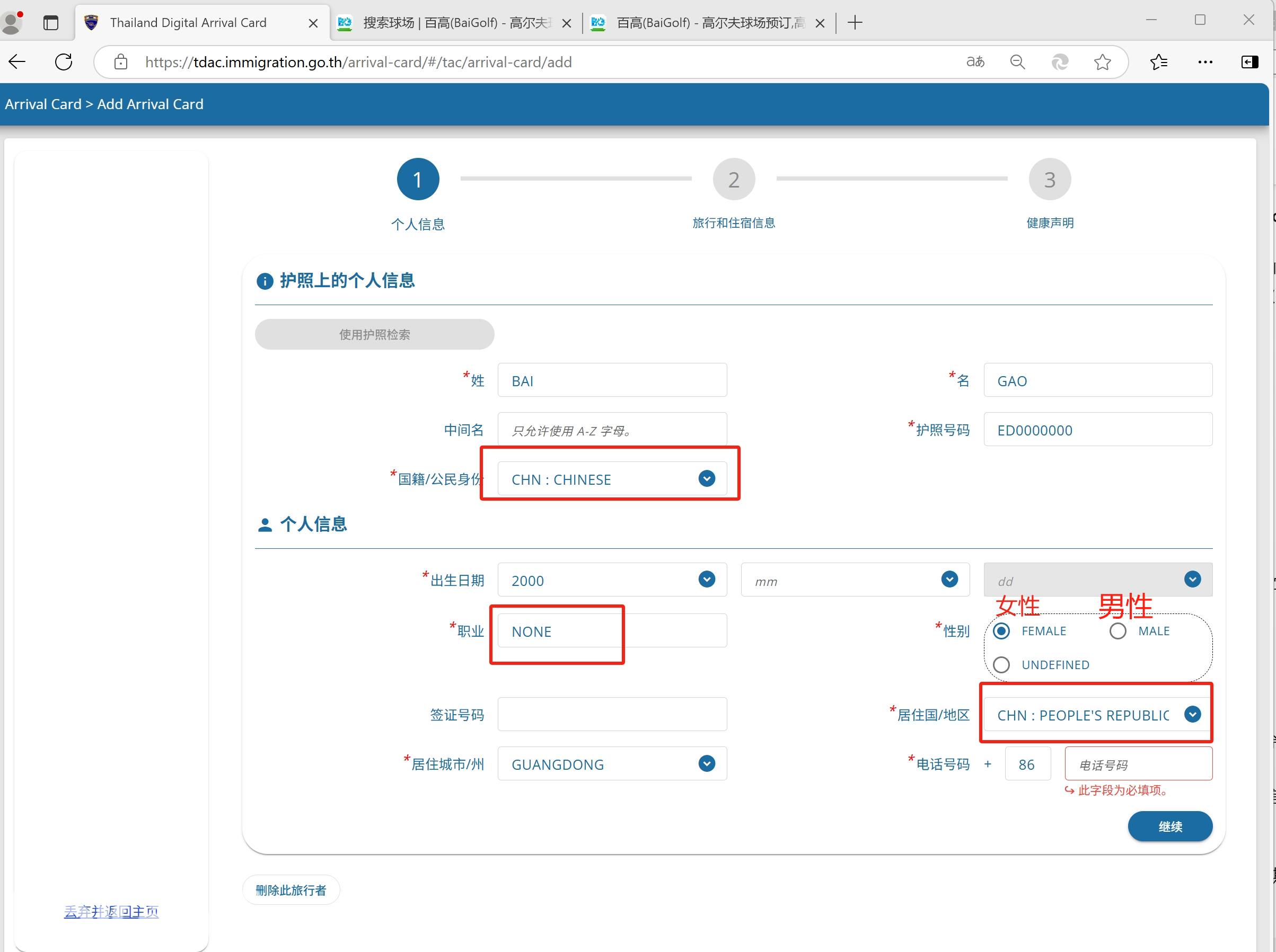 所有添加星号的为必填项;国籍是英文的,用CHN搜索;职业根据自身情况填写;居住国家,CHN : PEOPLE'S REPUBLIC OF CHINA。