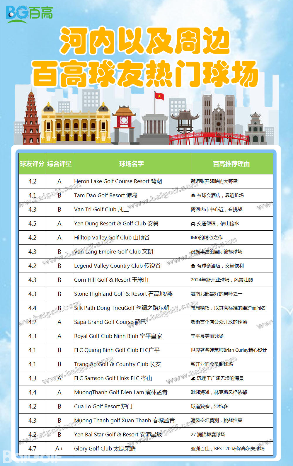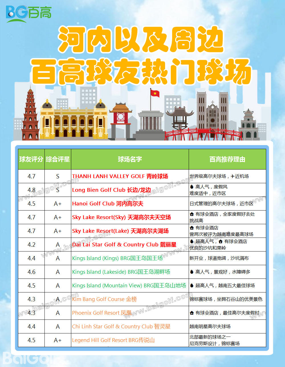 天湖(19年亚洲百佳)+河内高尔夫(日式管理)+BRG传说山(锦标赛场)