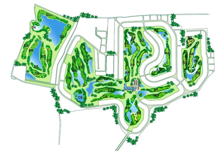 สนาม ABC และ D มีลักษณะที่แตกต่างกันอย่างมาก โดยรวมแล้ว สนามนี้ยาวและมีน้ำมาก ทำให้ผู้เล่นที่เล่นแบบโค้งต้องเล่นยากขึ้น หลุม 27 หลุมของสนาม A, B และ C ค่อนข้างเก่า มีต้นไม้สูงชะลูด และมีแอ่งน้ำเป็นครั้งคราวในจุดสำคัญ ทำให้เล่นยาก
