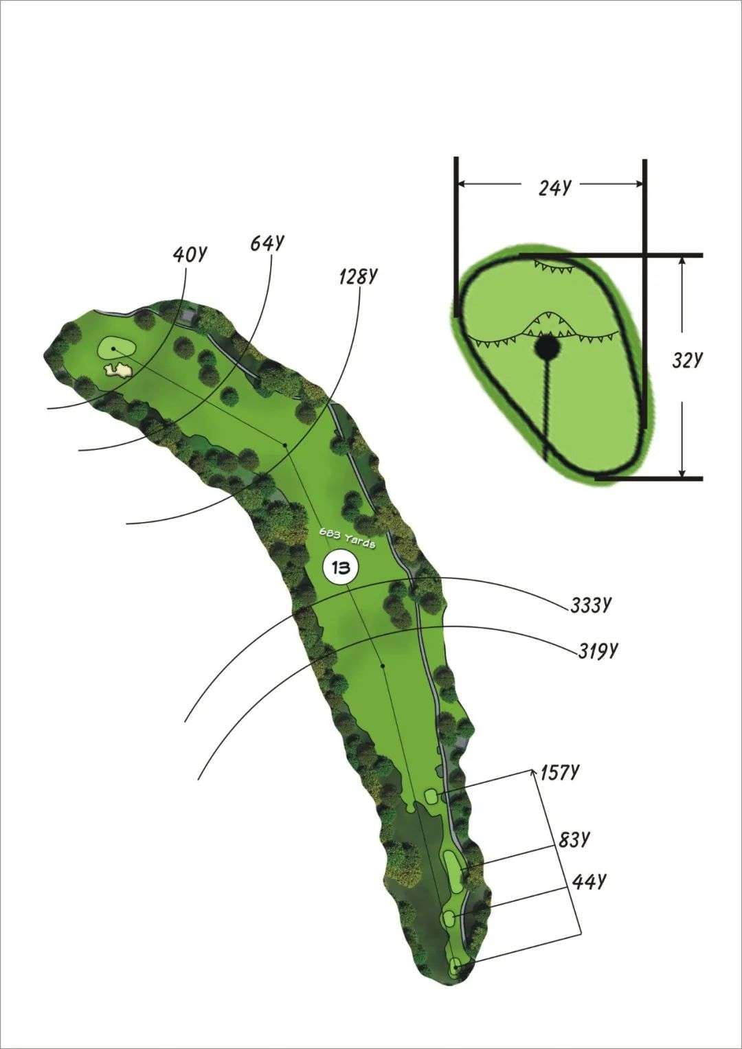 这是一个真正的需要三杆上果岭的双狗腿五杆洞,前两杆打得顺利的话,第三杆上果岭将变得很容易。发球的一杆,越过一大片沙坑群,对于力大的球手,过了第一落点就是顺坡下去,球可以往前滚很远。第二杆落球区域在距果岭100码区域又是一大片沙坑。果岭由一较陡的分水岭隔开洞杯区域,如果落点不好,将给推杆带来很大困难。