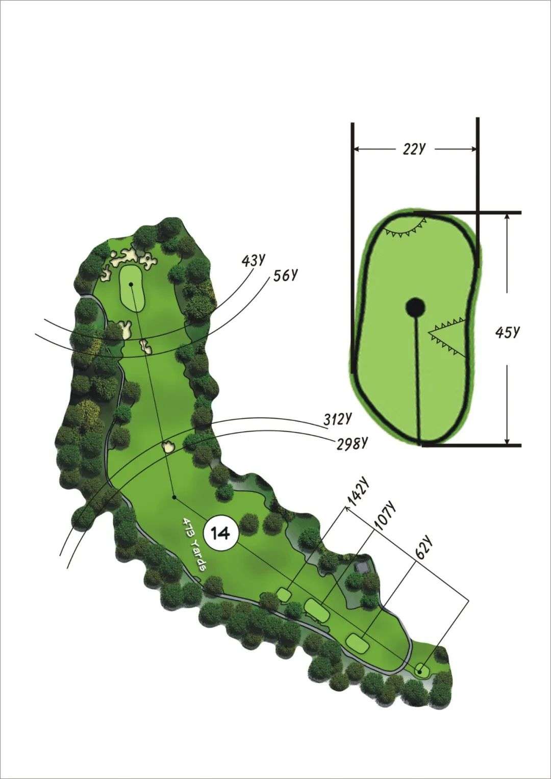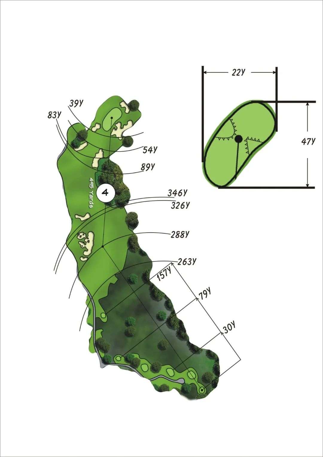 长四杆,球道是由左向右急转。虽然球道宽阔,但由于树木的原因限制了落球点位置。第二杆上果岭,果岭旁边是一自然岩石组成的观赛平台,果岭背面是沙坑和陡坡惩罚打偏的落球。果岭起伏明显,需要谨慎寻找落球点,特别是果岭背面洞杯区域。