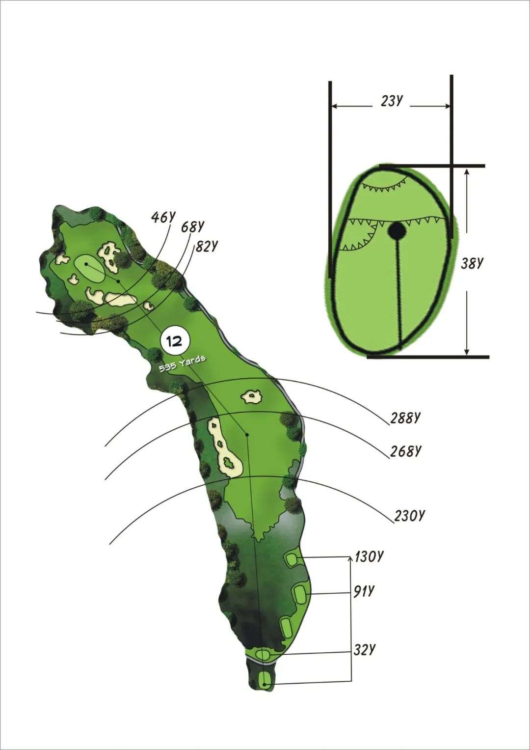 长四杆,非常有挑战性。球道非常宽阔,第一杆发球尽量力大一些,这样有机会能落在较好的位置,让球继续沿着地形坡度向前滚,这样的话,第二杆到果岭也就是大约175码,果岭周围沙坑密集,果岭上有一顺坡将球喂向果岭右侧的“耳垂”洞杯区域。四杆入洞是非常好的成绩。