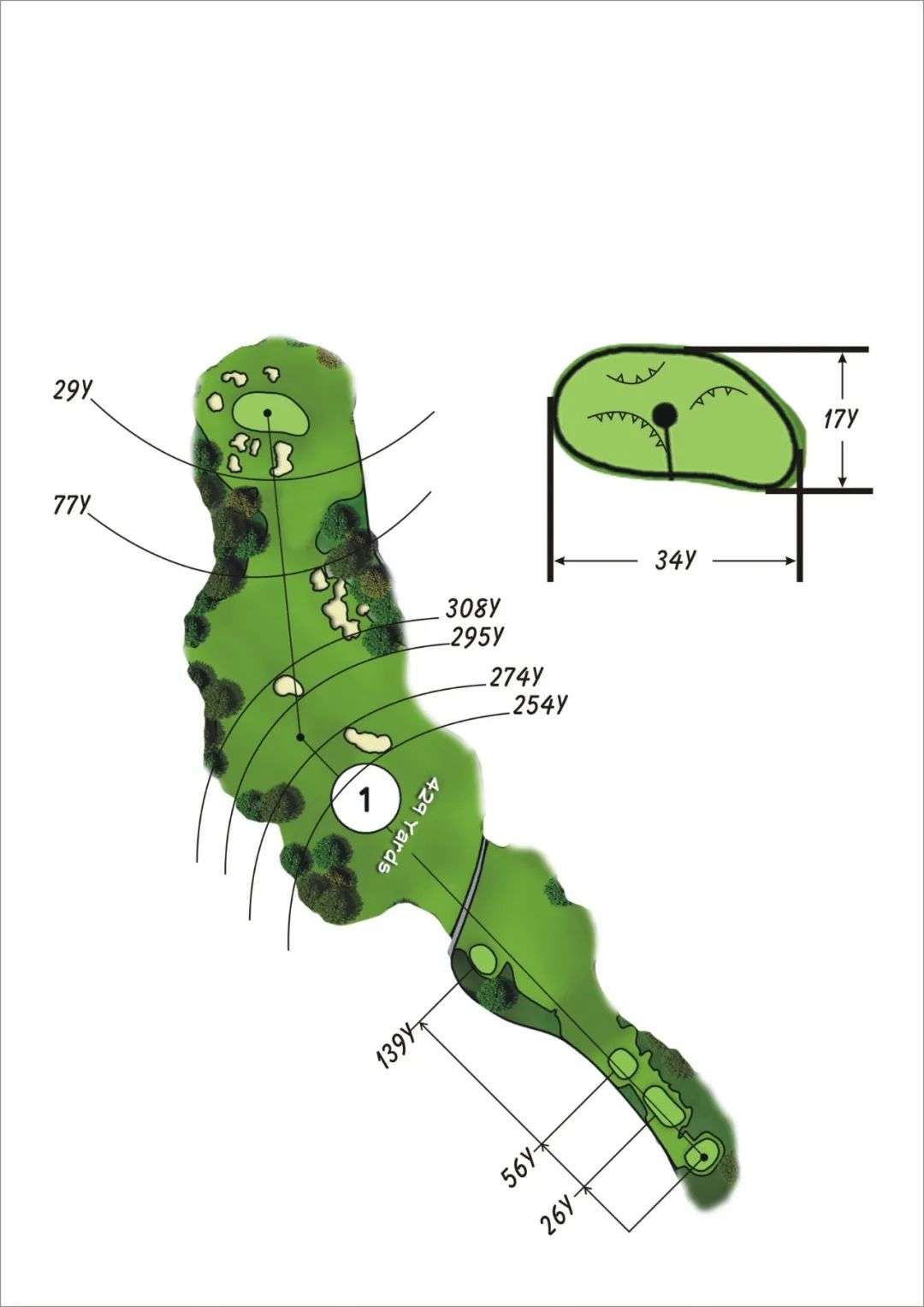 球道宽阔,是一较容易的开场之洞。力大球手可以选择直接越过第一落球区域的沙坑。果岭居于一条分水岭之上,前面被沙坑包围,并且有一陡坡。球道周围被一大片火山岩包围,从球场的一开始就凸现出球场的火山岩特征。