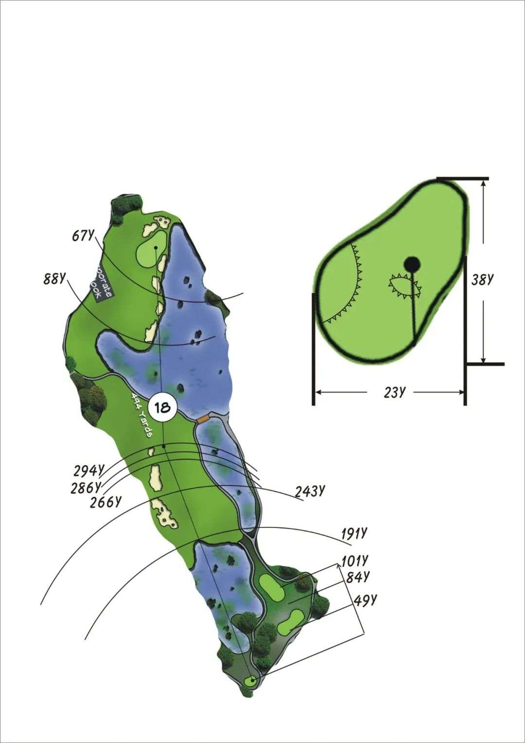 第一杆令人胆战心惊,需要越过湿地和火山岩。如果你想两杆上果岭,第一杆必须长并且精确。果岭依偎于湖边,经验的球手会从果岭左侧攻击,顺应地形将球喂入果岭。果岭后面景观如画,有树,有沙,还有壮观的会所,使得该收尾球道更加令人难忘。上果岭后开始推杆,全神贯注,完成该球场的最后精彩一推。