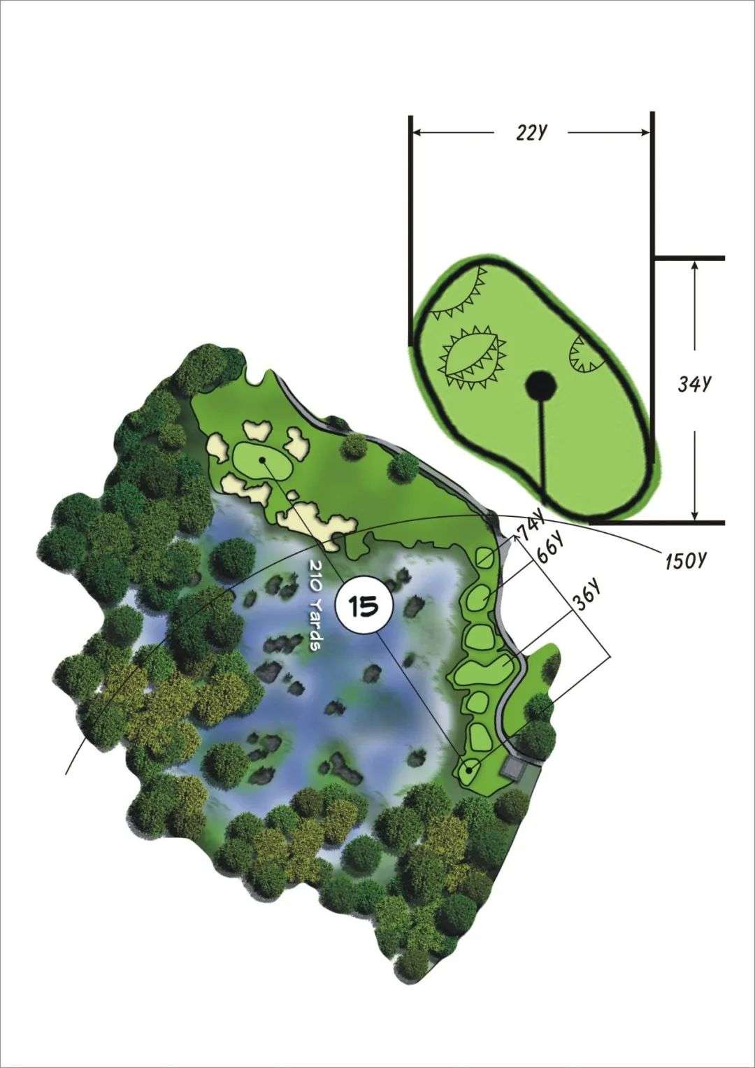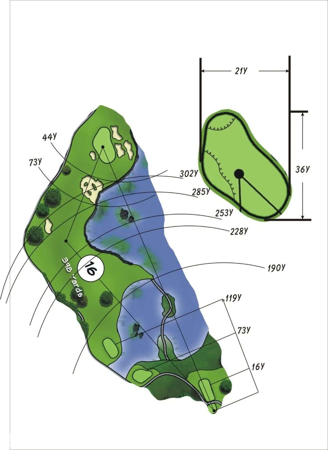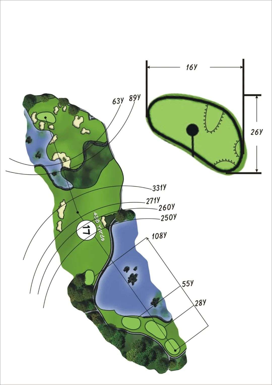 该球道两杆上果岭应该没有问题。由于球道右侧的湖面,使得球手有多种发球方案。力大的球手可以直接越过湖面上果岭,也可以尽量靠近果岭的左侧,或靠近球道沙坑的位置。第二杆上果岭距离比较短,但是果岭周围沙坑密集,还有陡坡,会相应增加难度,所以该球道会产生很明显的低分和高分的区别。
