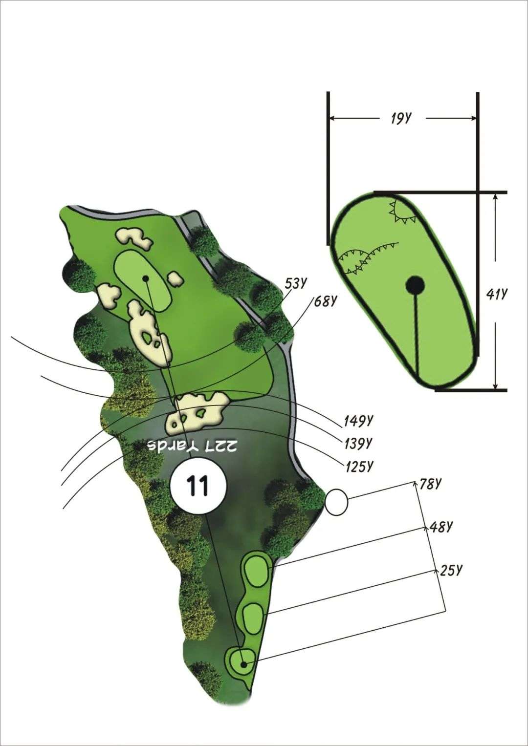 中长三杆洞。果岭周围被沙坑围住,但是果岭相对较平,果岭旁边有一自然的岩石平台和成熟的荔枝树。发球台以及半个球道区域都被岩石包围,看起来确实令人生畏。但沉着冷静些,将会有惊无险。