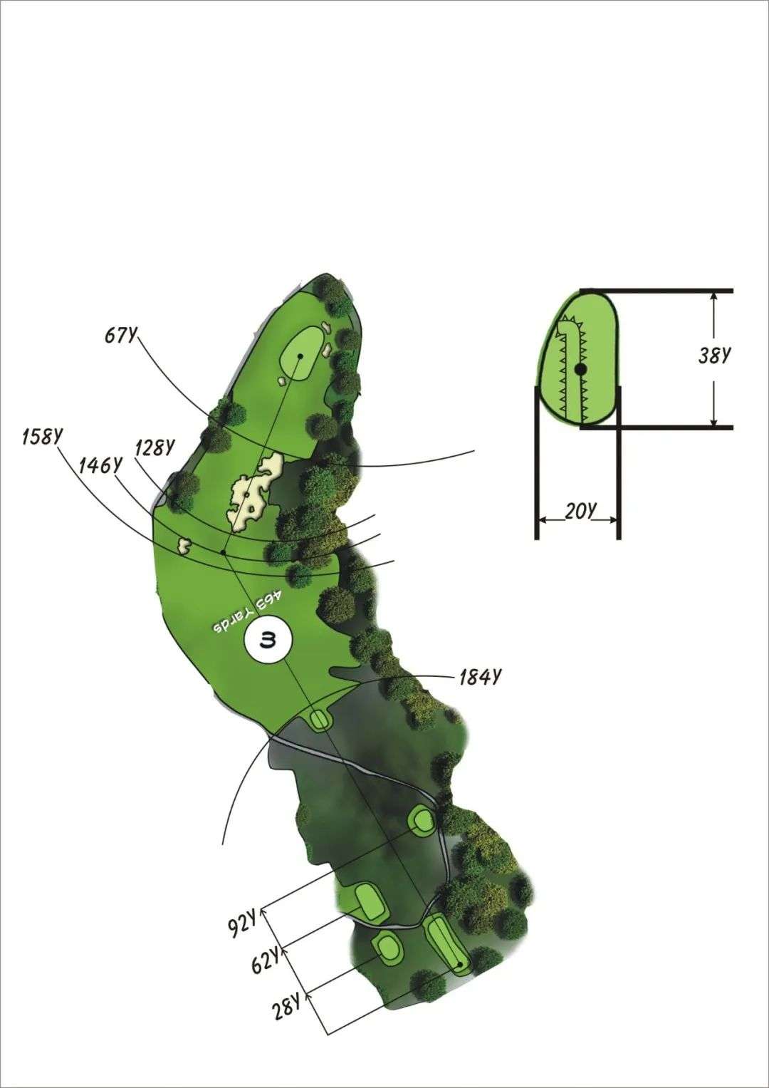 三杆洞,发球台高程较高,球道距离长而且充满障碍。果岭位于较低的区域,形状是从右向左展开,果岭左前方有一个大而深的沙坑保护。球道右侧是球道落球区域,但是从这里救球时必须越过右边的一个山墩,这就要求一杆精确的切杆。