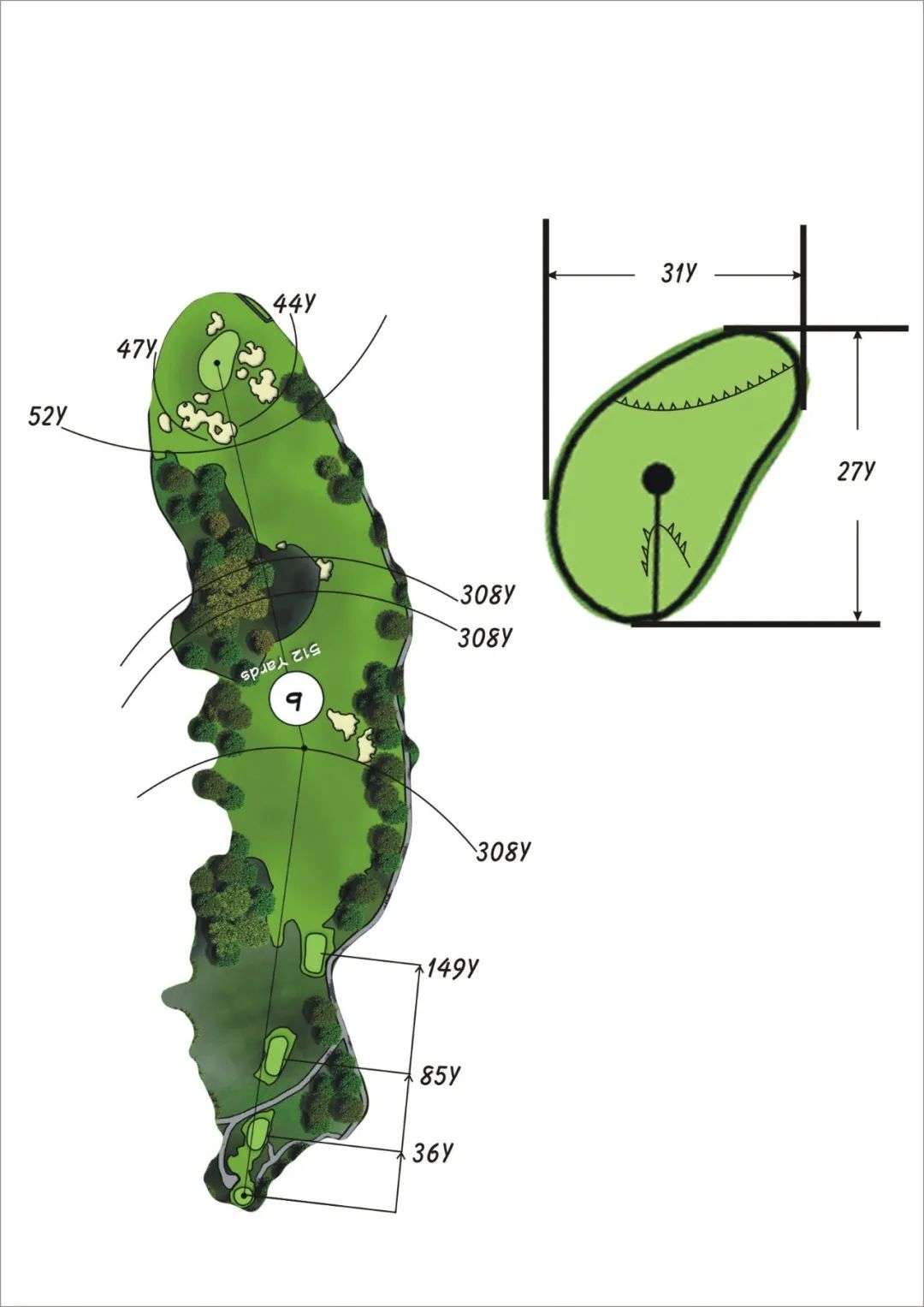 从发球台发球有多种选择,落点区域呈拱形向球道两边斜下去,所以落球需要避免落在落点的右侧,右侧是较陡的坡。越过转点处的大沙坑可以将距离缩短,打得顺利的话,第二杆到果岭的距离大约是150码。果岭右侧较平坦,左侧有一条较陡的分水岭,落到此处的球会迅速向左侧滚去。果岭旁边有一自然的平台,可以由观众观赛。