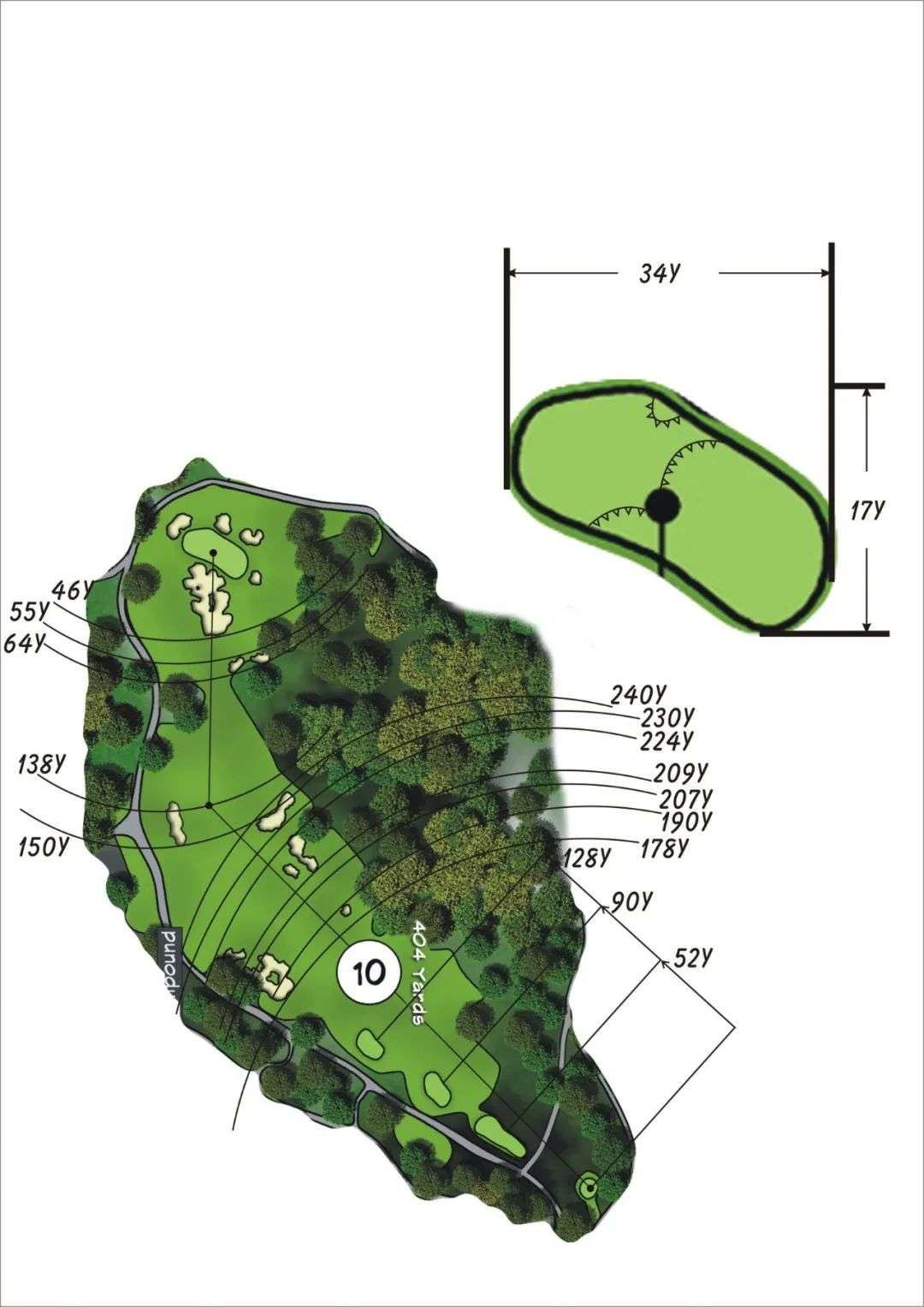 短四杆,在球道落球区域有一锅型沙坑,所以使得发球选择线路有三个。可以击球越过锅型沙坑,也可以不超过,还可以落在沙坑右侧。落在沙坑的左侧是不好的选择,因为此处有一远古废弃的墙和一群树木,这会阻碍下一杆的上果岭。果岭较小并起伏大,果岭背后是一群树木。如果选择线路适当,这一球道应该较容易。