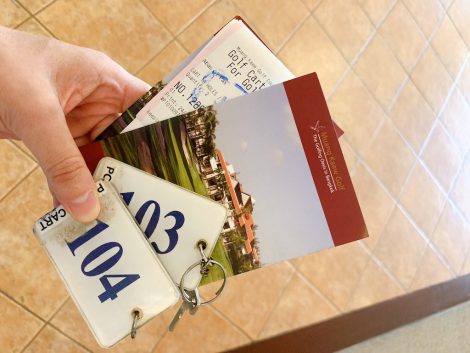 ที่สนามกอล์ฟ Muan Gewo เมื่อคุณเช็คอิน คุณจะได้รับกุญแจและบัตรคะแนนพร้อมหมายเลขรถกอล์ฟของคุณพิมพ์อยู่ ซึ่งแตกต่างจากสนามกอล์ฟอื่นๆ เล็กน้อย