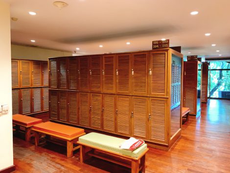 ตู้เก็บของอยู่ตรงข้ามกับโปรช็อป กรุณาเขียนชื่อและหมายเลขกุญแจล็อกเกอร์ของคุณลงบนกระดาษที่แผนกต้อนรับตามปกติ แล้วรับกุญแจ ห้องล็อกเกอร์ได้รับการปรับปรุงใหม่ทั้งหมดเป็นไม้และสะอาดมาก