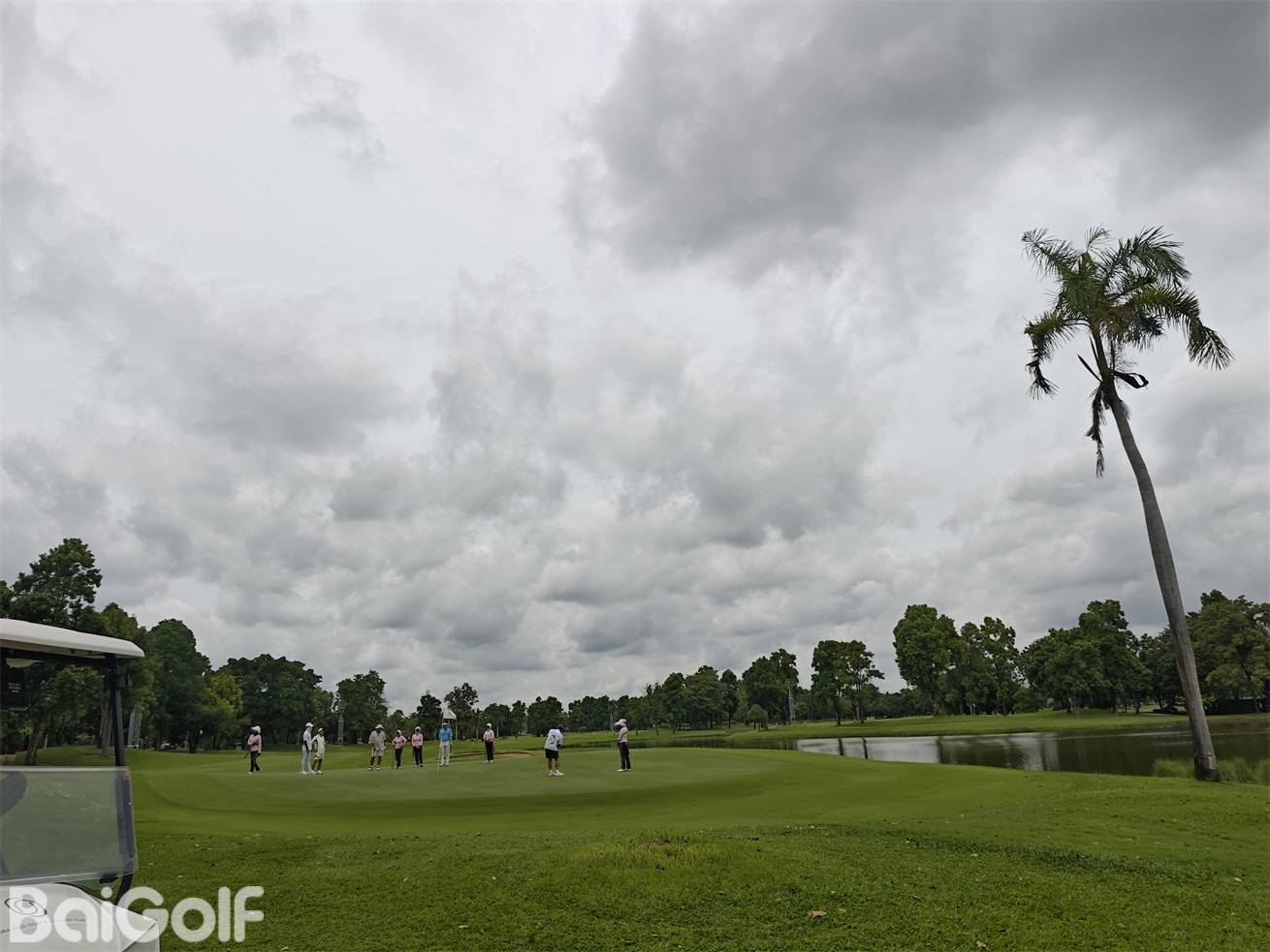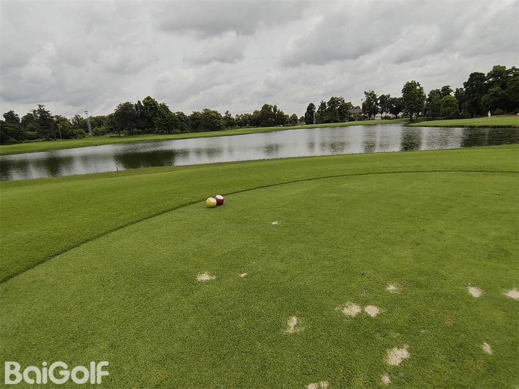 果岭起伏平缓,球滚动轨迹直线清晰,建议与球童充分沟通后谨慎击球。